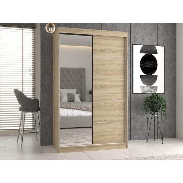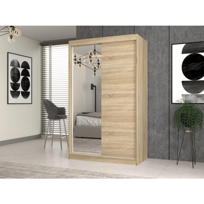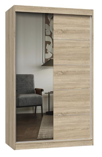 Szafa przesuwna w kolorze dąb sonoma z ozdobnymi listwami na frontach to propozycja do pokoju dziennego, ale znajdzie swoje miejsce również w innym pomieszczeniu, jak na przykład - przedpokój czy garderobie. Materiał wykonania to płyta laminowana. Szafa posiada półki oraz drążek na ubrania. Mebel posiada lustro, które sprawi, że pomieszczenie stanie się optycznie większe. Nowoczesny styl mebli wpadnie do gustu każdemu, kto poszukuje eleganckiego, klasycznego, a zarazem nowoczesnego umeblowania. Idealnie wpasuje się w większość aranżacji. Przeznaczona do samodzielnego montażu.