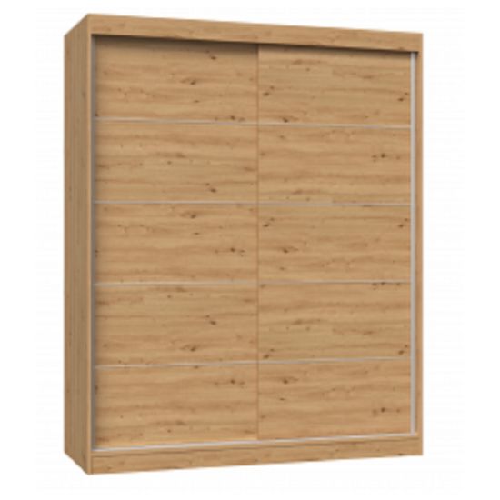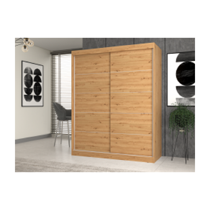 Szafa przesuwna w kolorze dąb artisan z ozdobnymi listwami na frontach to propozycja do pokoju dziennego, ale znajdzie swoje miejsce również w innym pomieszczeniu, jak na przykład - przedpokój czy garderobie. Materiał wykonania to płyta laminowana. Szafa posiada półki oraz drążek na ubrania. Nowoczesny styl mebli wpadnie do gustu każdemu, kto poszukuje eleganckiego, klasycznego, a zarazem nowoczesnego umeblowania. Idealnie wpasuje się w większość aranżacji. Przeznaczona do samodzielnego montażu.