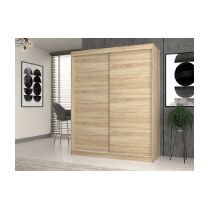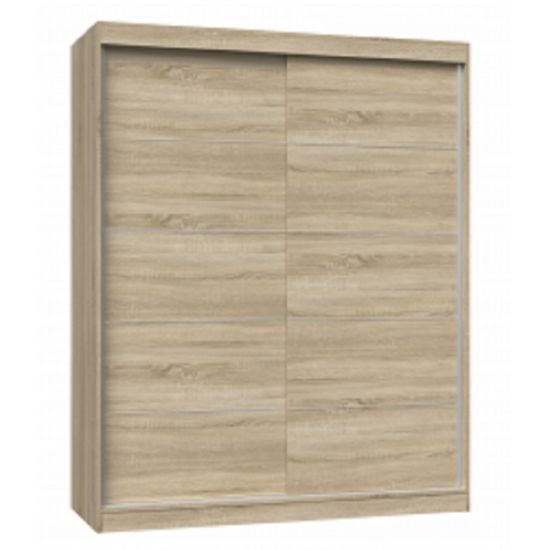 Szafa przesuwna w kolorze dąb sonoma z ozdobnymi listwami na frontach to propozycja do pokoju dziennego, ale znajdzie swoje miejsce również w innym pomieszczeniu, jak na przykład - przedpokój czy garderobie. Materiał wykonania to płyta laminowana. Szafa posiada półki oraz drążek na ubrania. Nowoczesny styl mebli wpadnie do gustu każdemu, kto poszukuje eleganckiego, klasycznego, a zarazem nowoczesnego umeblowania. Idealnie wpasuje się w większość aranżacji. Przeznaczona do samodzielnego montażu.