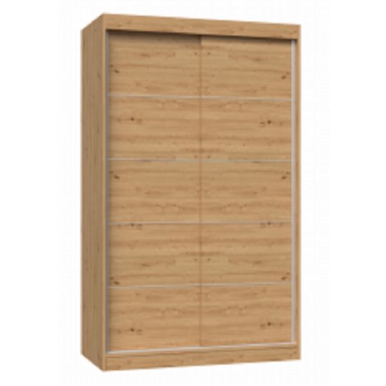 Szafa przesuwna w kolorze dąb artisan z ozdobnymi listwami na frontach to propozycja do pokoju dziennego, ale znajdzie swoje miejsce również w innym pomieszczeniu, jak na przykład - przedpokój czy garderobie. Materiał wykonania to płyta laminowana. Szafa posiada półki oraz drążek na ubrania. Nowoczesny styl mebli wpadnie do gustu każdemu, kto poszukuje eleganckiego, klasycznego, a zarazem nowoczesnego umeblowania. Idealnie wpasuje się w większość aranżacji. Przeznaczona do samodzielnego montażu.