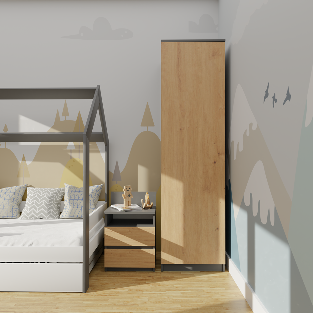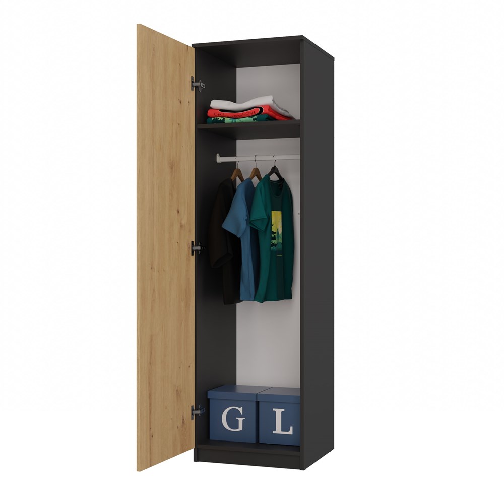 Szafa z uchylnymi drzwiami w kolorze antracyt/dąb artisan z kolekcji Salomea to doskonała propozycja do pokoju dziennego, ale znajdzie swoje miejsce również w innym pomieszczeniu, jak na przykład w przedpokoju czy garderobie, sypialni. Materiał wykonania to płyta wiórowa laminowana o grubości 16 mm. Szafa posiada możliwość montażu półek lub drążka na ubrania w zależności od wymagań, a także system TIP-ON drzwi szafy - otwierają się po delikatnym naciśnięciu frontu za pomocą mechanicznego wspomagania otwierania. Szafa przeznaczona do samodzielnego montażu. Wygląd szafy sprawi, że wpasuje się w większość aranżacji. Szafa będzie świetnym miejscem do wieszania ubrań.