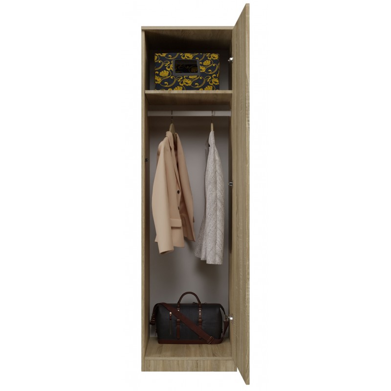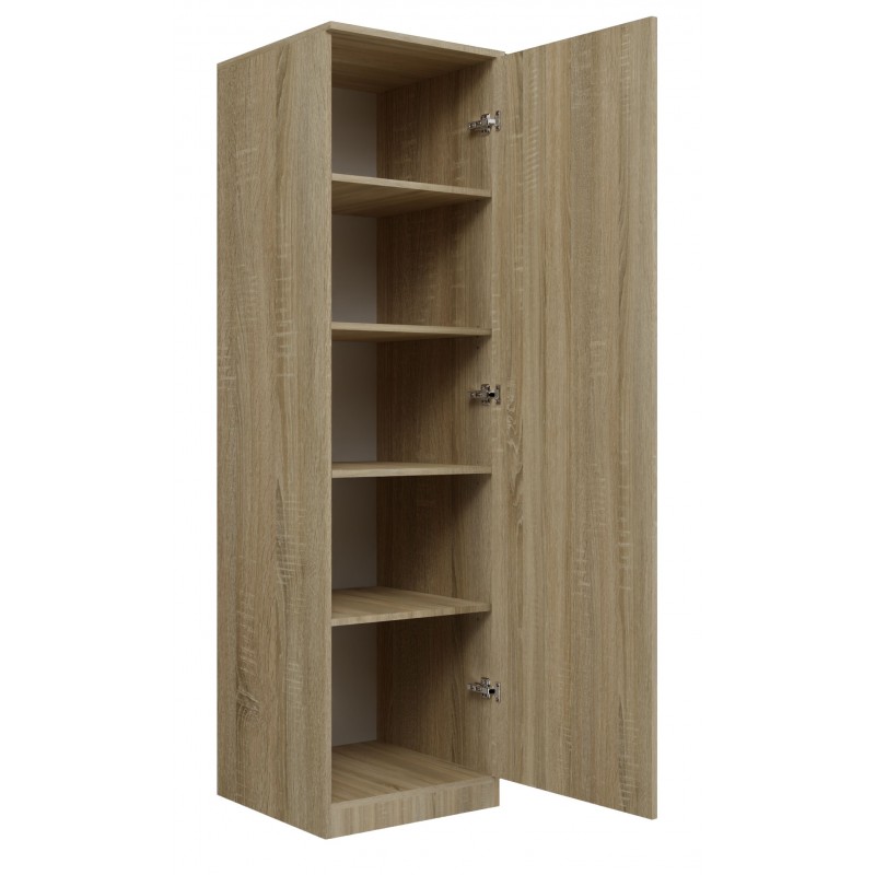 Szafa z uchylnymi drzwiami w kolorze dab sonoma z kolekcji Salomea to doskonała propozycja do pokoju dziennego, ale znajdzie swoje miejsce również w innym pomieszczeniu, jak na przykład w przedpokoju czy garderobie, sypialni. Materiał wykonania to płyta wiórowa laminowana o grubości 16 mm. Szafa posiada możliwość montażu półek lub drążka na ubrania w zależności od wymagań, a także system TIP-ON drzwi szafy - otwierają się po delikatnym naciśnięciu frontu za pomocą mechanicznego wspomagania otwierania. Wysokość między półkami: 33 cm. Szafa przeznaczona do samodzielnego montażu. Wygląd szafy sprawi, że wpasuje się w większość aranżacji. Szafa będzie świetnym miejscem do wieszania ubrań.