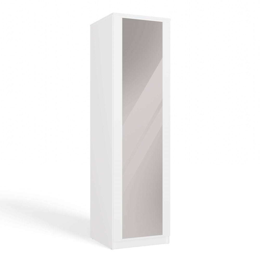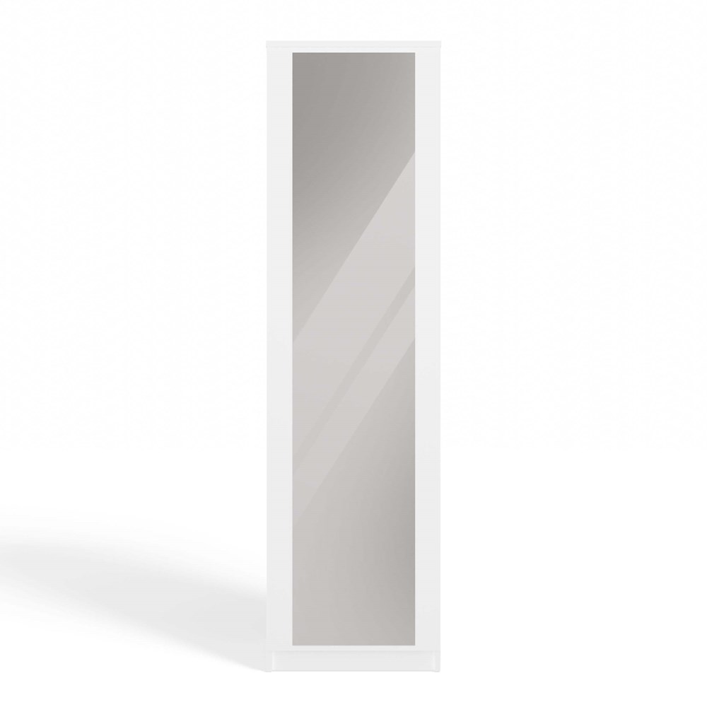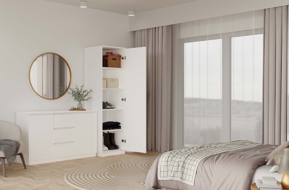 Szafa Salomea z lustrem to nowoczesne i funkcjonalne rozwiązanie do przechowywania, idealne szczególnie do niewielkich pomieszczeń. Wykonana z wysokiej jakości laminowanej płyty wiórowej o grubości 16 mm, w eleganckim wykończeniu białego matu, doskonale wpisuje się w minimalistyczne i jasne aranżacje wnętrz. Pełnowymiarowe, szlifowane lustro na froncie optycznie powiększa przestrzeń, nadając wnętrzu lekkości i nowoczesnego charakteru.