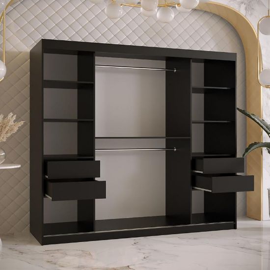 Kolor frontów szafy Sandakan nadaje meblowi wyrafinowanego wyglądu. Fronty wykonane są z trwałej płyty wiórowej laminowanej, co gwarantuje nie tylko estetykę, ale także trwałość mebla. Matowe wykończenie dodaje szafie nowoczesności i eliminuje odblaski świetlne. Korpus szafy Sandakan utrzymany jest w czarnym matowym kolorze, co tworzy spójny i elegancki wygląd całego mebla. Konstrukcja korpusu oparta jest na solidnej płycie wiórowej laminowanej, co gwarantuje trwałość i stabilność szafy.