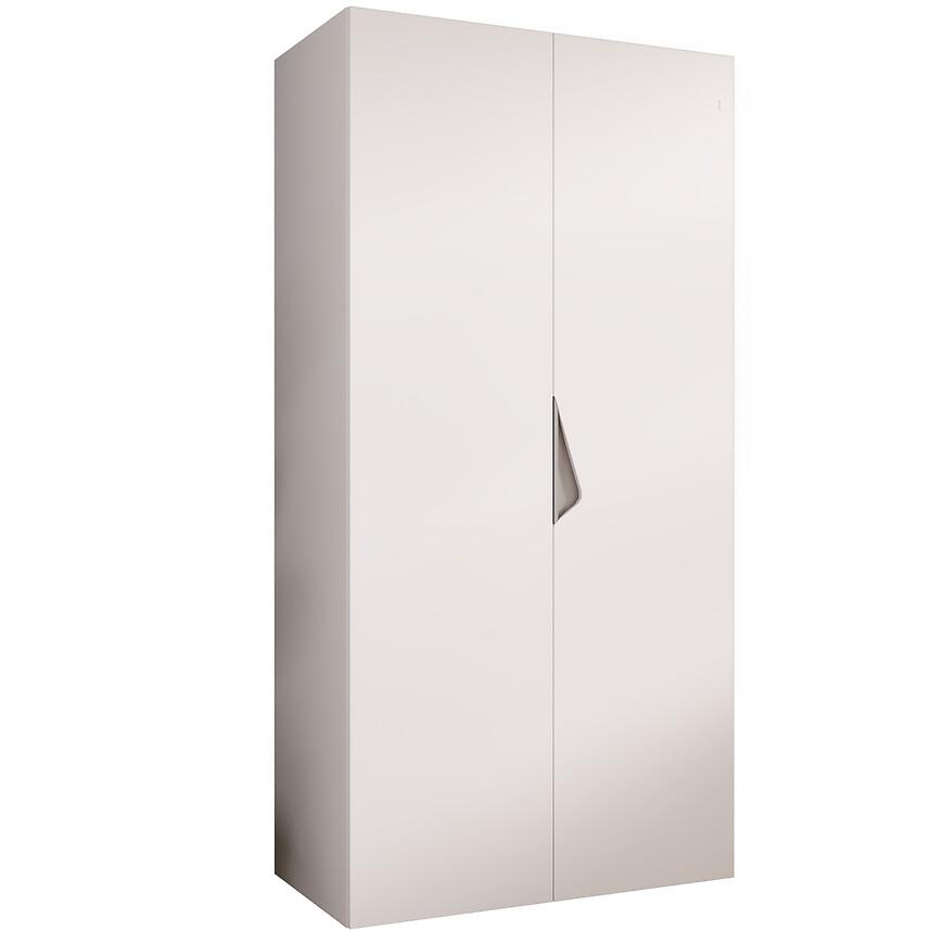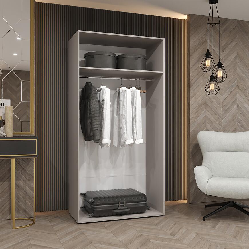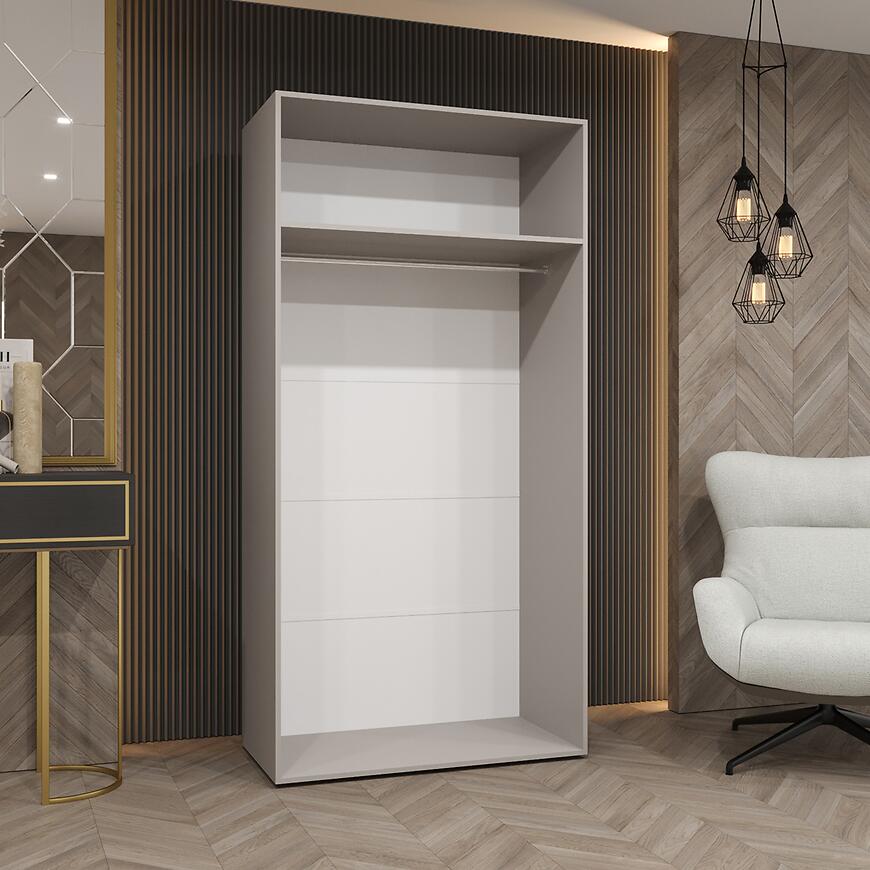 Minimalistyczny design, matowe wykończenie i biało-kaszmirowe wybarwienie sprawiają, że szafa pasuje do różnych aranżacji wnętrz. Brak lustra dodaje lekkości i ułatwia utrzymanie mebla w czystości.