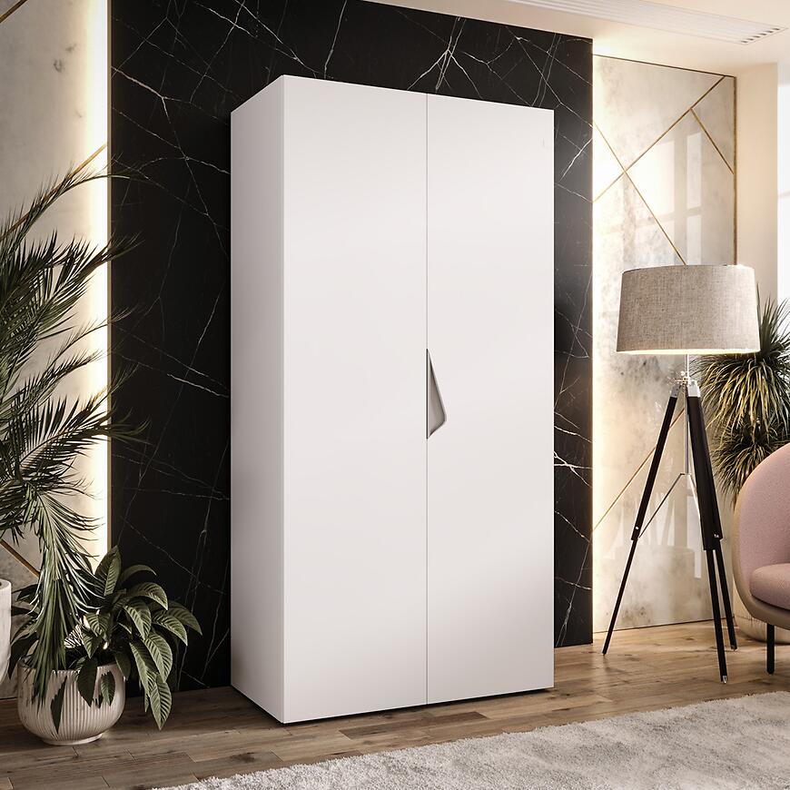 Szafa ma 100 cm szerokości, 202 cm wysokości i 52 cm głębokości, co sprawia, że oferuje dużo miejsca do przechowywania, nie zajmując przy tym nadmiernie przestrzeni w pomieszczeniu. Korpus wykonano z płyty wiórowej laminowanej, a fronty z płyty laminowanej w matowym wykończeniu, co gwarantuje trwałość i odporność na codzienne użytkowanie. Klasyczne, dwudrzwiowe drzwi ułatwiają dostęp do wnętrza, jednocześnie zachowując minimalistyczny charakter szafy.