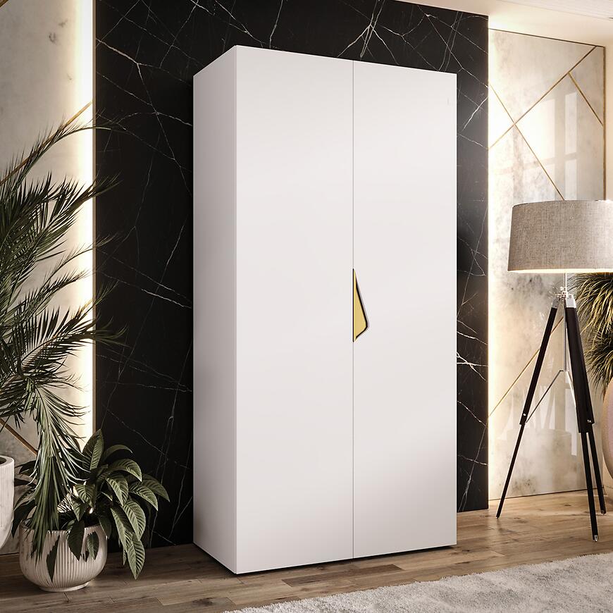 Szafa Sandi 1-100 w kolorze biało-złotym to propozycja dla osób ceniących elegancki wygląd i praktyczne rozwiązania. Matowe białe fronty w połączeniu ze złotymi detalami nadają wnętrzu subtelnego luksusu, a prosty, nowoczesny kształt sprawia, że szafa świetnie komponuje się w różnych aranżacjach. Dwudrzwiowa konstrukcja pozwala wygodnie przechowywać ubrania i akcesoria, zachowując porządek i estetykę przestrzeni.
