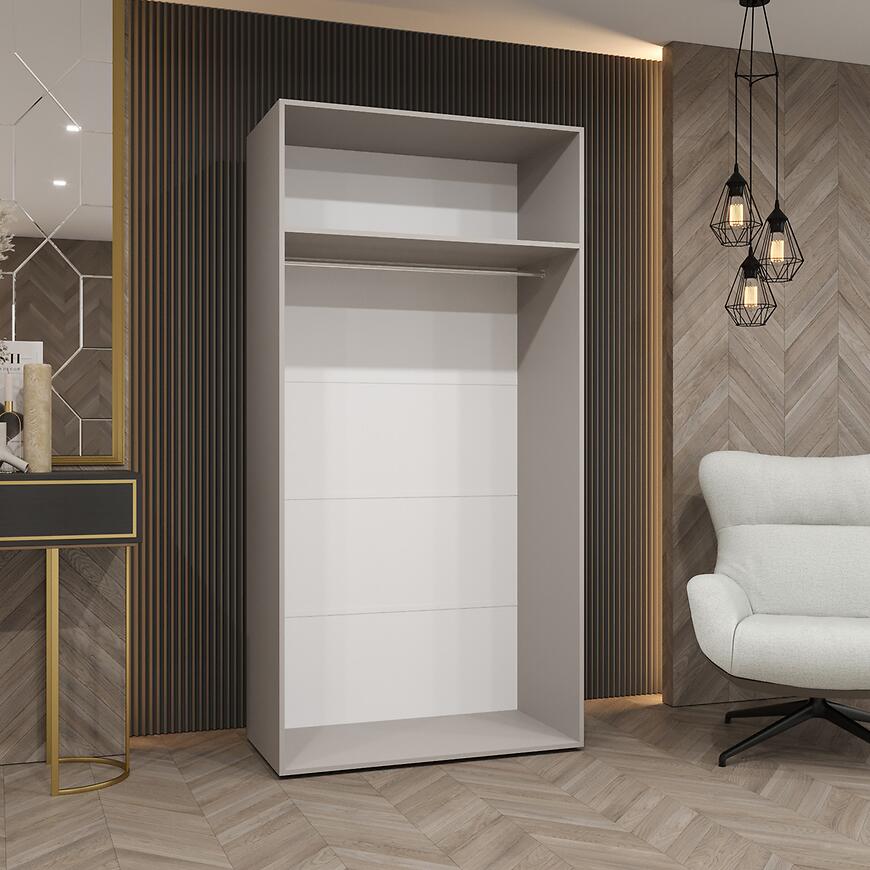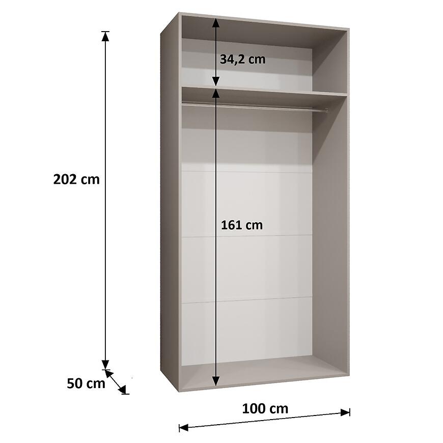 Szafa ma 100 cm szerokości, 202 cm wysokości i 52 cm głębokości, oferując odpowiednią przestrzeń do przechowywania. Korpus wykonano z płyty wiórowej laminowanej, a fronty z płyty laminowanej w matowym wykończeniu, co zapewnia trwałość i odporność na codzienne użytkowanie. Klasyczne dwudrzwiowe drzwi ułatwiają dostęp do wnętrza, zachowując minimalistyczny charakter mebla.