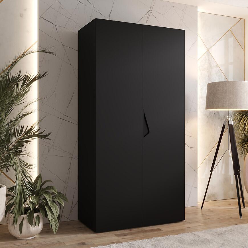 Szafa Sandi 1-100 czarny/czarny to nowoczesny, elegancki mebel, który łączy minimalistyczny design z praktycznym przechowywaniem. Dwudrzwiowa konstrukcja, solidne materiały i matowe, głębokie wybarwienie sprawiają, że szafa będzie stylowym i trwałym elementem każdego wnętrza.