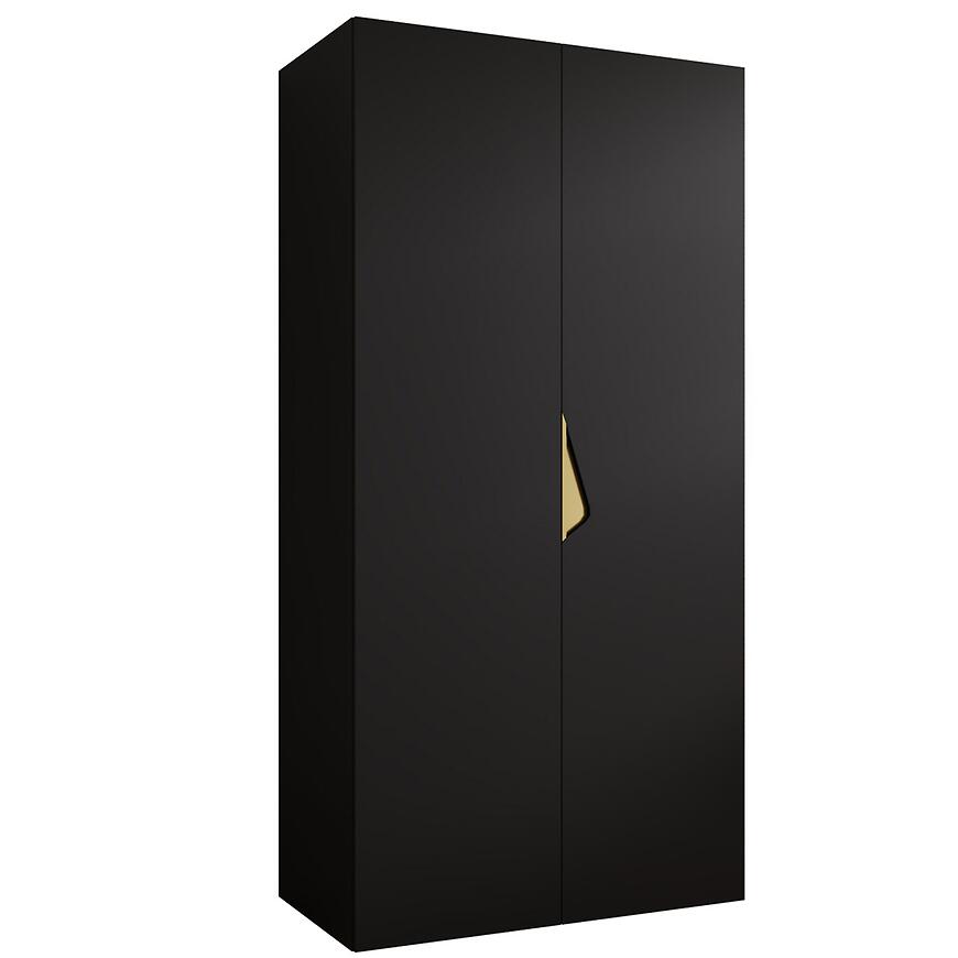 Szafa Sandi 1-100 w kolorze czarnym ze złotymi detalami łączy nowoczesny design z funkcjonalnością. Matowe czarne fronty i korpus w połączeniu ze złotymi akcentami nadają wnętrzu elegancji i wyrazistego charakteru. Dwudrzwiowa konstrukcja zapewnia wygodne przechowywanie ubrań i akcesoriów, zachowując porządek i estetyczny wygląd wnętrza.