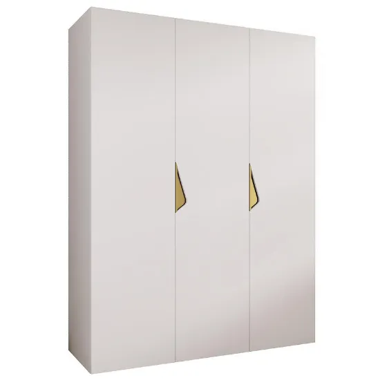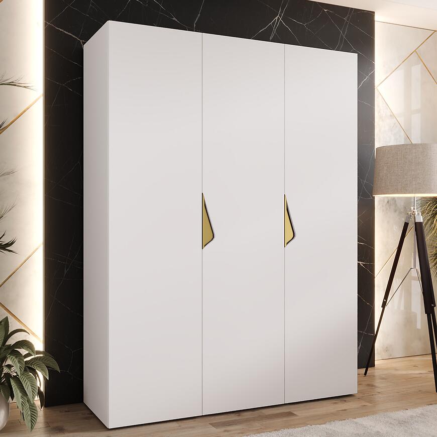 Szafa Sandi 1-150 w wersji biały/złoty łączy nowoczesny minimalizm z funkcjonalnością. Jej matowe fronty i korpus w odcieniu białym nadają wnętrzu elegancji, a prosta forma sprawia, że łatwo dopasować ją do różnych aranżacji.