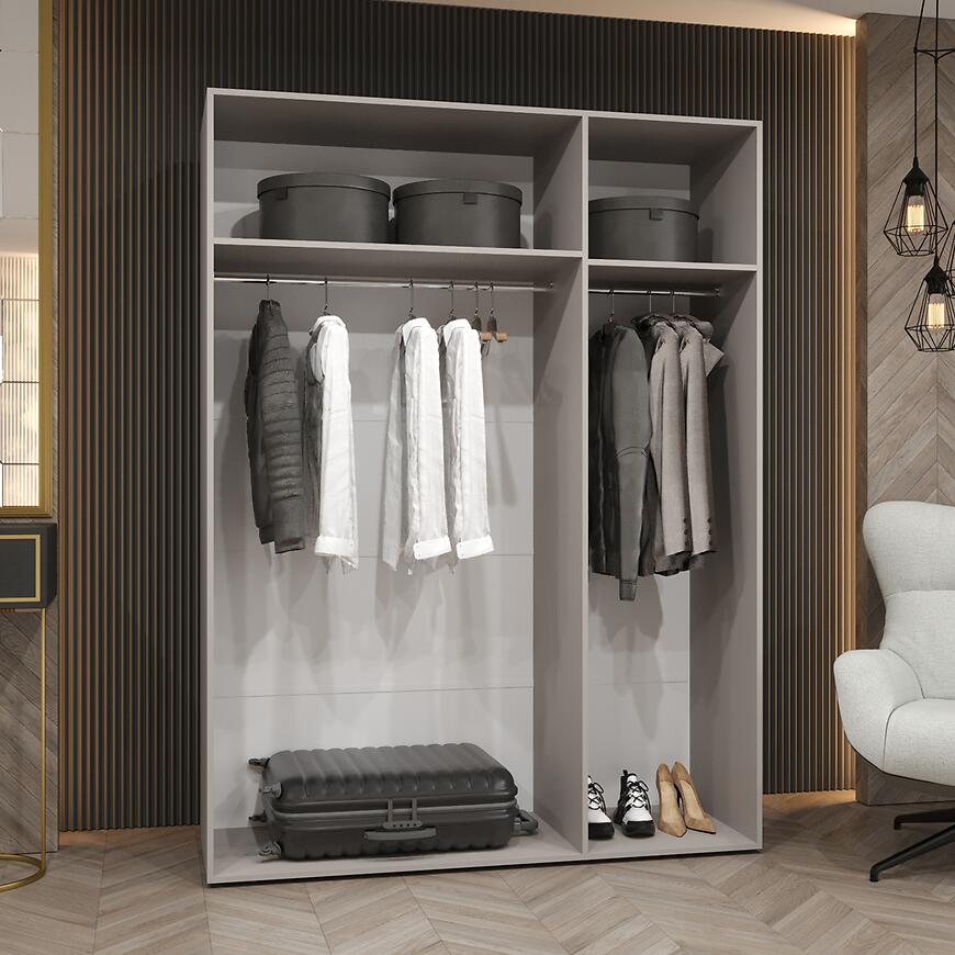 Szafa Sandi 1-150 kaszmir/kaszmir łączy elegancję z funkcjonalnością, tworząc praktyczny i nowoczesny mebel do przechowywania.