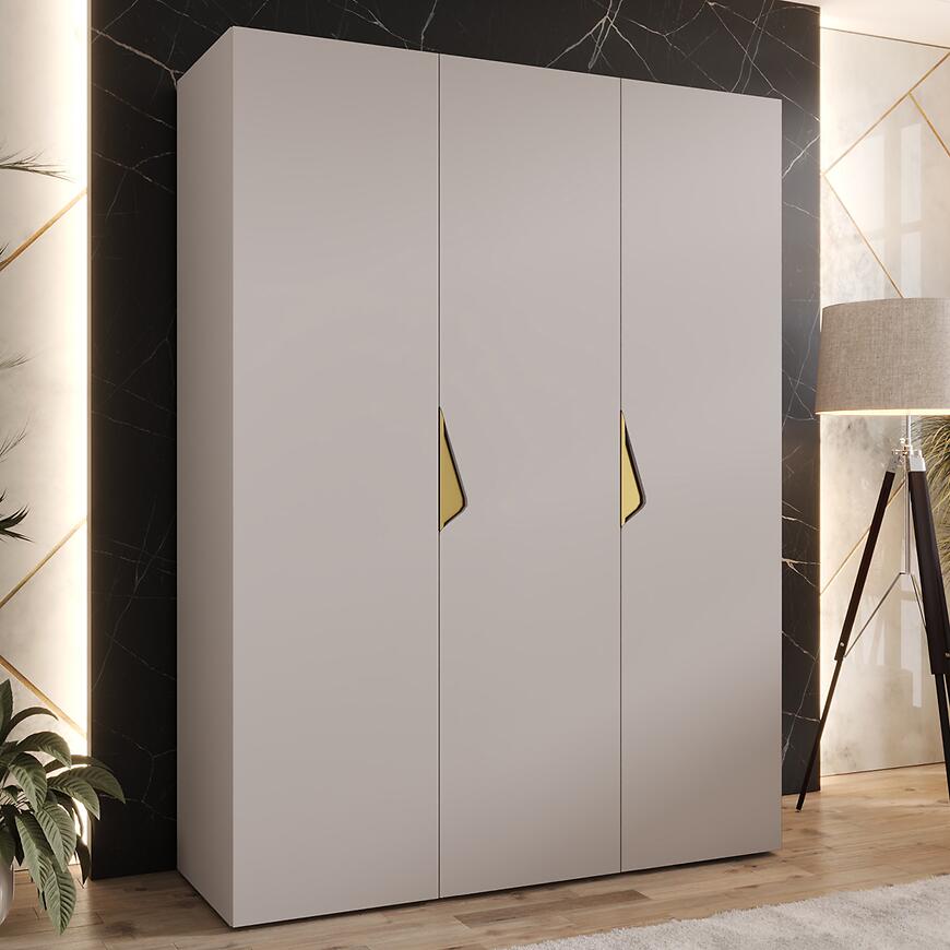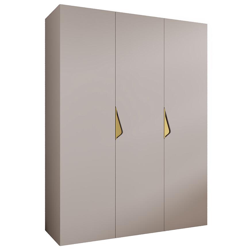 Szafa Sandi 1-150 w kolorze kaszmir/złoty to trzydrzwiowy mebel o prostym kształcie, który łączy elegancję z praktycznym rozwiązaniem do przechowywania ubrań i akcesoriów. Matowe fronty i korpus w odcieniu kaszmiru nadają szafie nowoczesny, subtelny wygląd, a złote detale mogą podkreślać wyrafinowany charakter mebla.