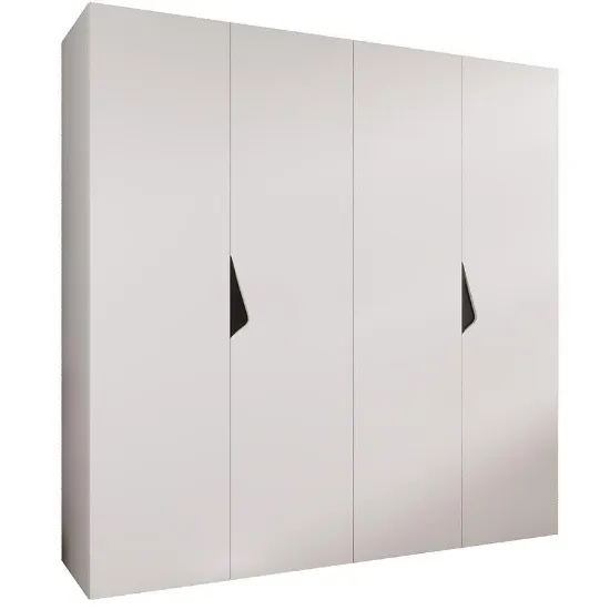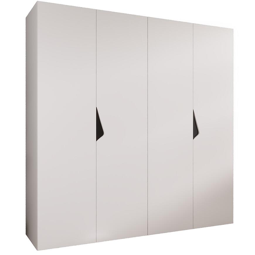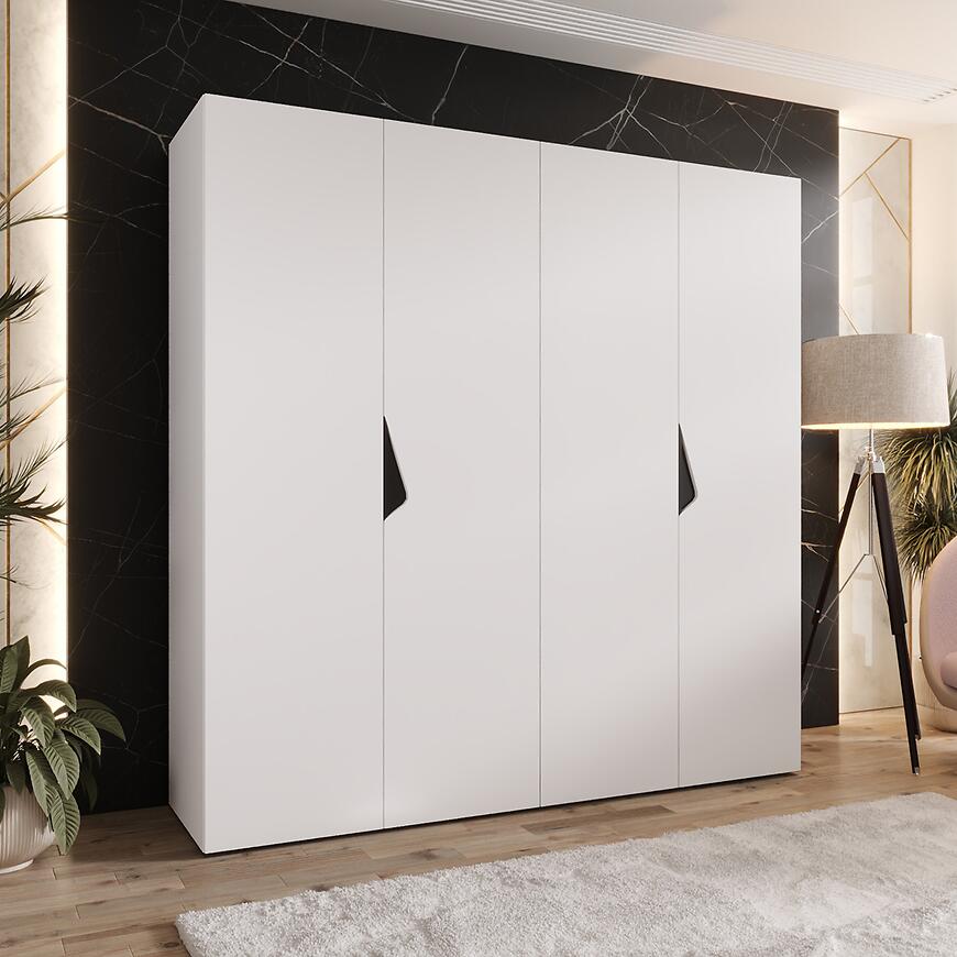 Szafa Sandi 1-200 w kolorze biały/czarny to kilkudrzwiowy mebel o prostym kształcie, łączący nowoczesny design z dużą pojemnością do przechowywania. Matowe fronty i korpus w białym kolorze zapewniają subtelną elegancję i uniwersalny wygląd.