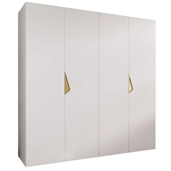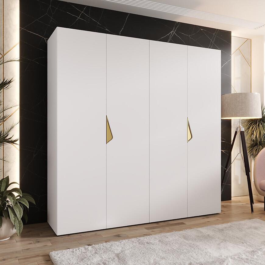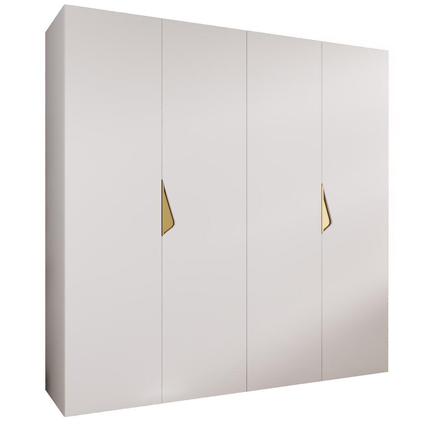 Szafa Sandi 1-200 w wykończeniu biały/złoty to kilkudrzwiowy mebel o prostym kształcie, łączący elegancję z praktycznym przechowywaniem. Matowe białe fronty i korpus nadają subtelny, nowoczesny charakter, idealny do różnych aranżacji.