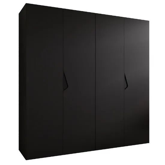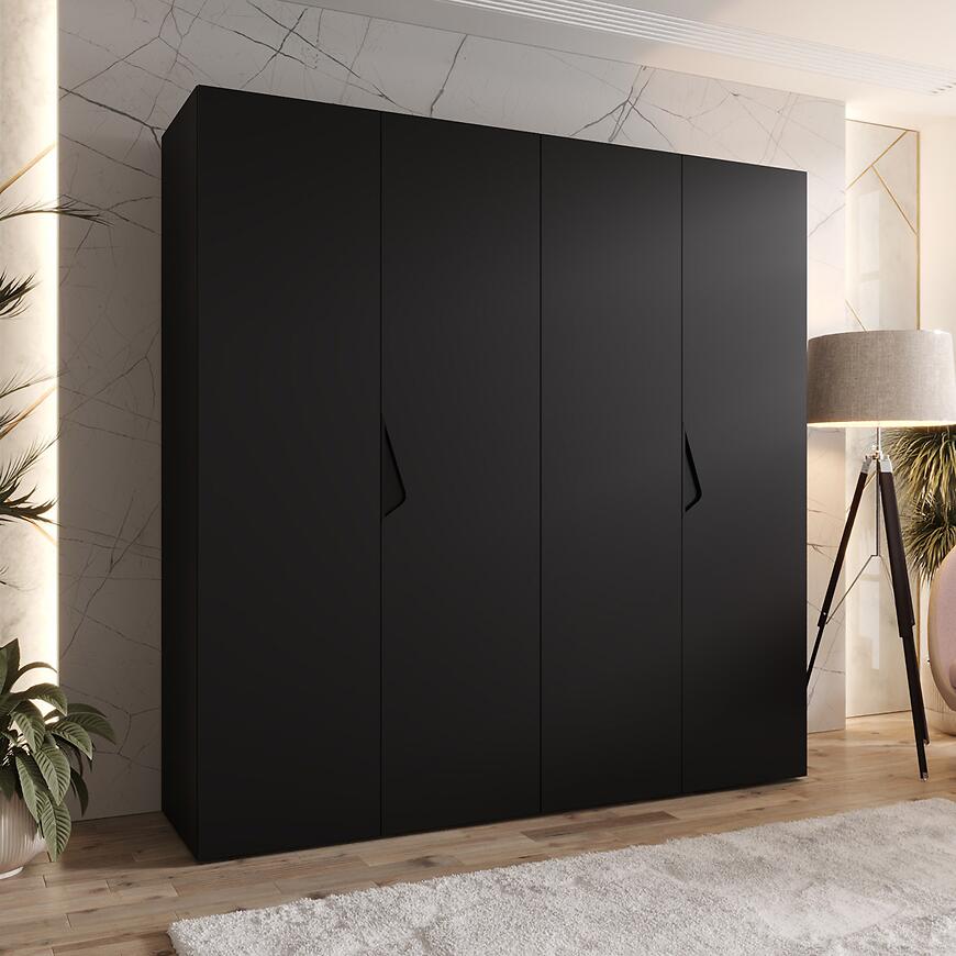 Szafa Sandi 1-200 w wykończeniu czarny/czarny to kilkudrzwiowy mebel o prostym, nowoczesnym kształcie. Matowe fronty i korpus w jednolitej czerni podkreślają minimalistyczny styl i uniwersalność szafy.