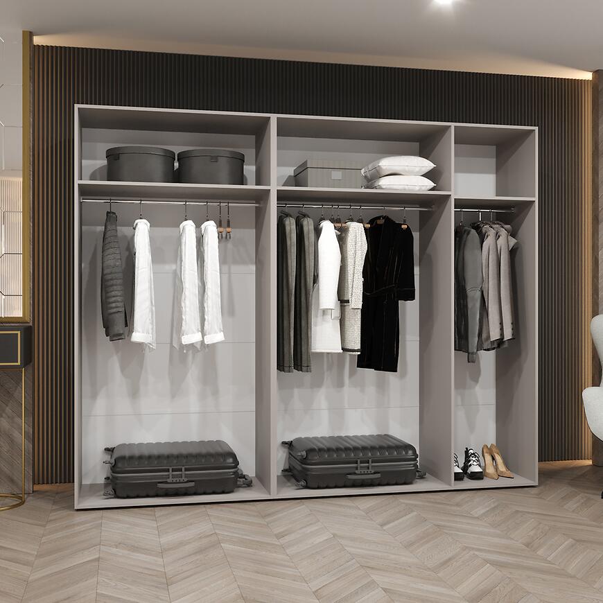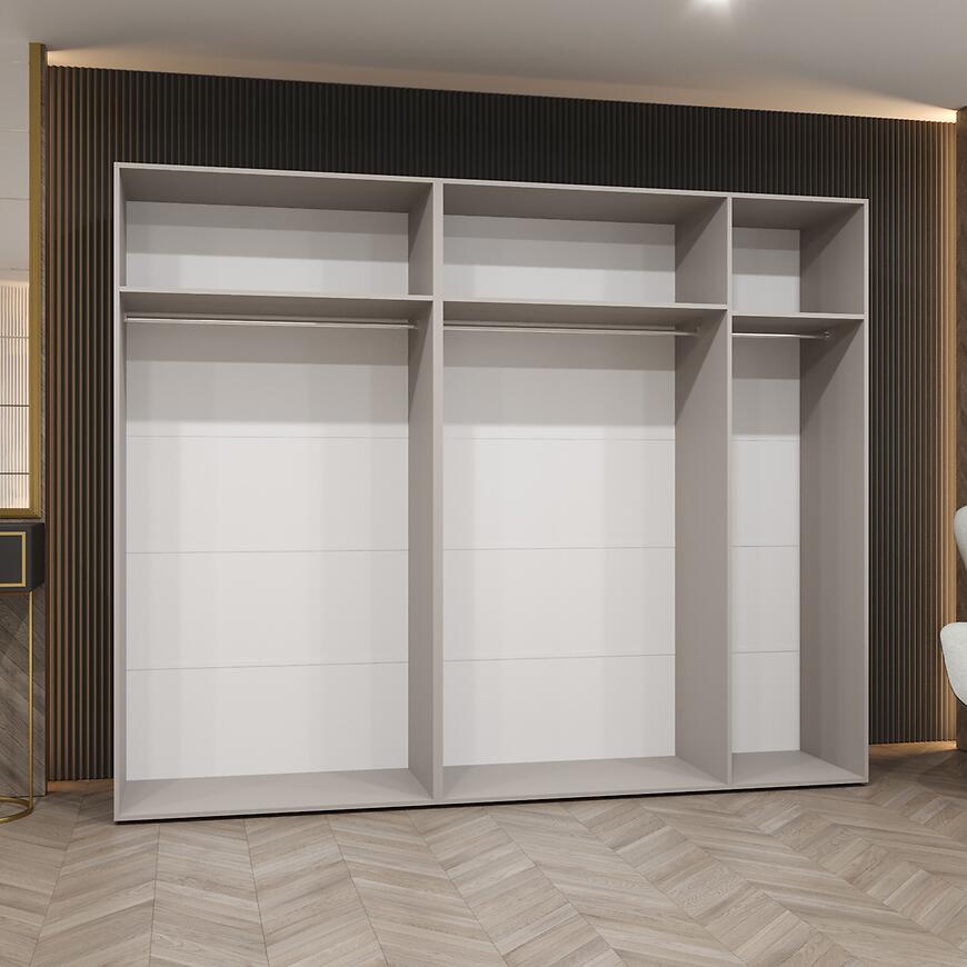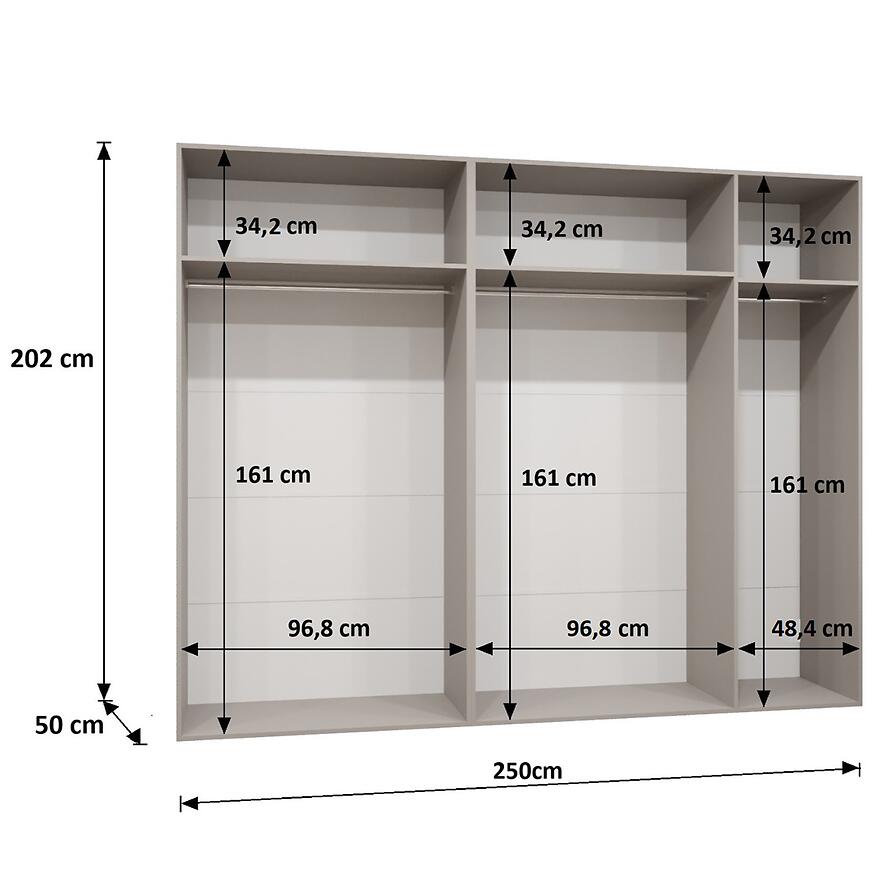 Wymiary 250 cm szerokości, 202 cm wysokości oraz 52 cm głębokości zapewniają przestronną powierzchnię do przechowywania odzieży i dodatków. Matowe fronty i korpus podkreślają nowoczesny charakter szafy, a czarne akcenty dodają subtelnej elegancji.