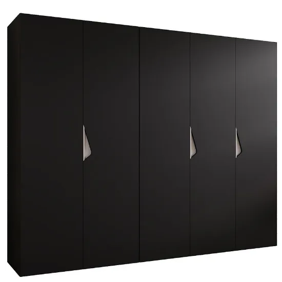 Szafa Sandi 1-250 z kolekcji SANDI to nowoczesna kilkudrzwiowa szafa o szerokości 250 cm, łącząca matową czerń z delikatnymi kaszmirowymi akcentami. Prosta bryła i minimalistyczny design wprowadzają do wnętrza elegancki i stylowy akcent.
