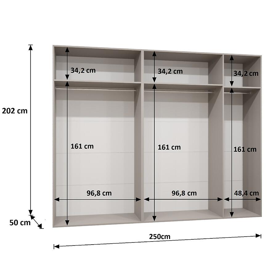 Wymiary 250 cm szerokości, 202 cm wysokości oraz 52 cm głębokości zapewniają przestronną powierzchnię do przechowywania ubrań i dodatków. Matowe fronty i korpus podkreślają nowoczesny charakter szafy, a kaszmirowe detale dodają subtelnej elegancji.