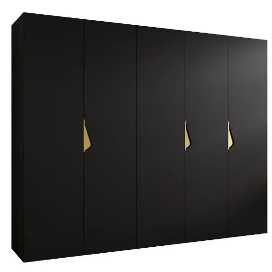 Szafa Sandi 1-250 z kolekcji SANDI to nowoczesna kilkudrzwiowa szafa o szerokości 250 cm, w matowej czerni z eleganckimi złotymi akcentami. Prosta, minimalistyczna bryła wprowadza do wnętrza stylowy i wyrafinowany charakter.