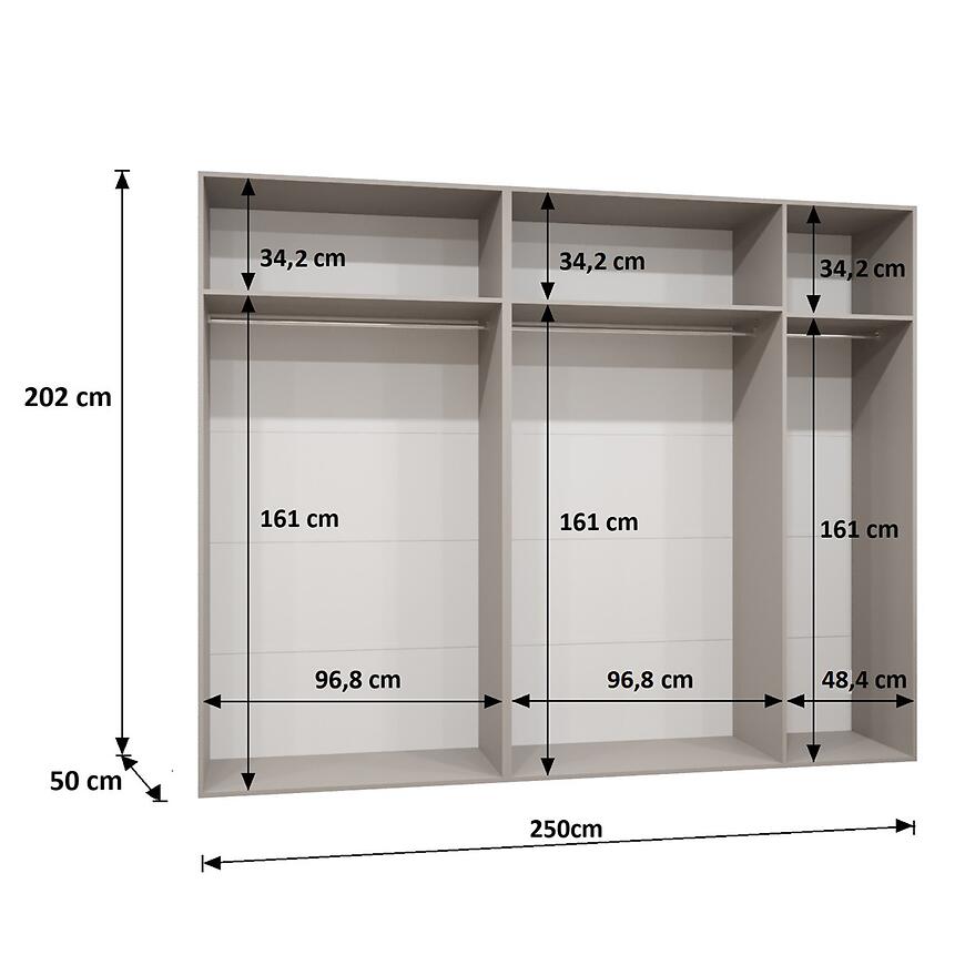 Wymiary 250 cm szerokości, 202 cm wysokości oraz 52 cm głębokości zapewniają dużą przestrzeń do przechowywania ubrań i dodatków. Matowe fronty i korpus podkreślają nowoczesny design, a złote detale nadają subtelnej elegancji.