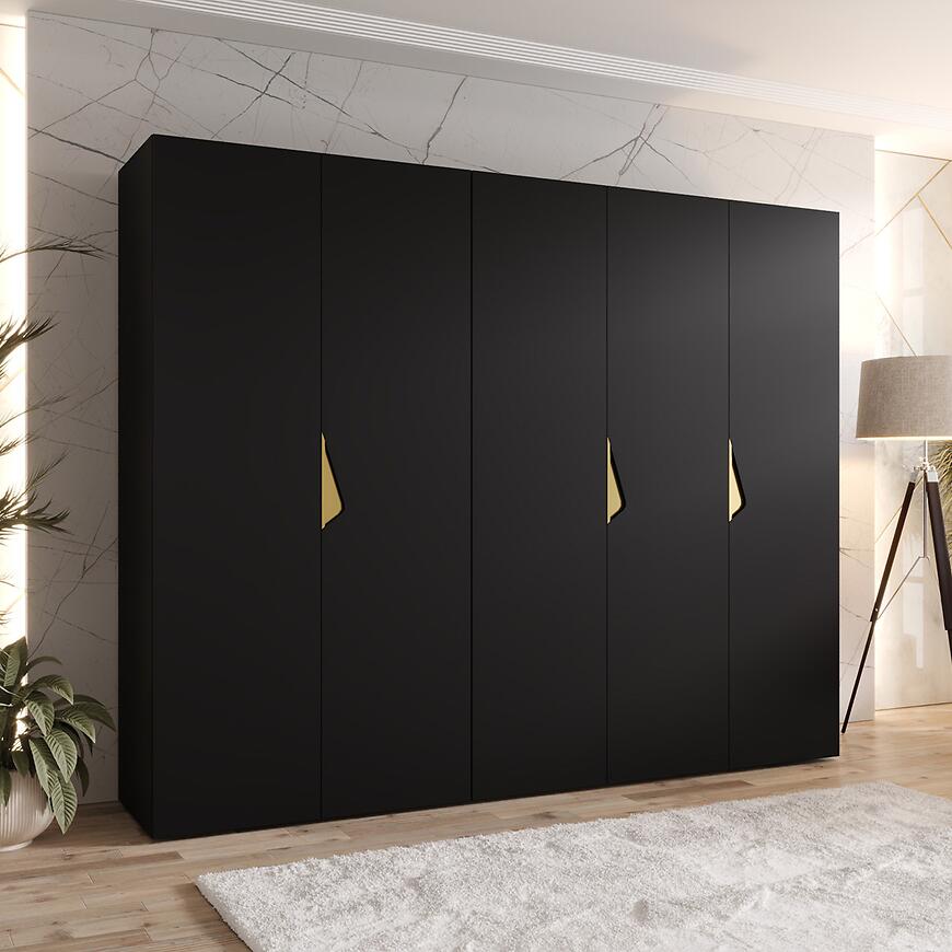 Szafa Sandi 1-250 czarny/złoty to nowoczesna, kilkudrzwiowa szafa, łącząca matową czerń z eleganckimi złotymi detalami, tworząc praktyczny i stylowy mebel do domu lub mieszkania.