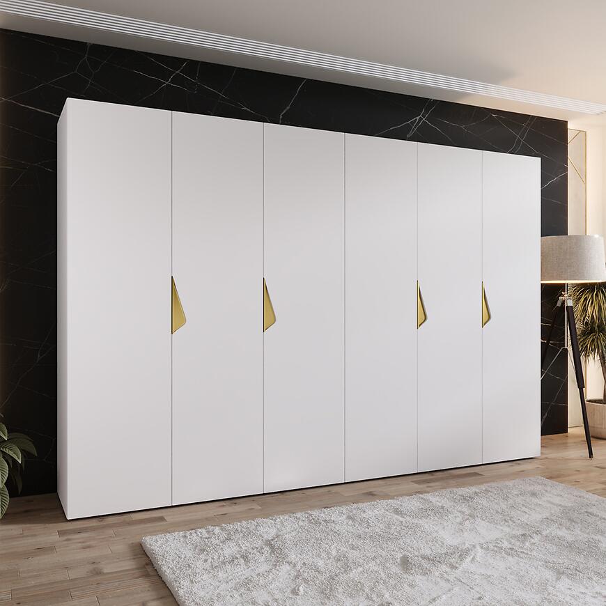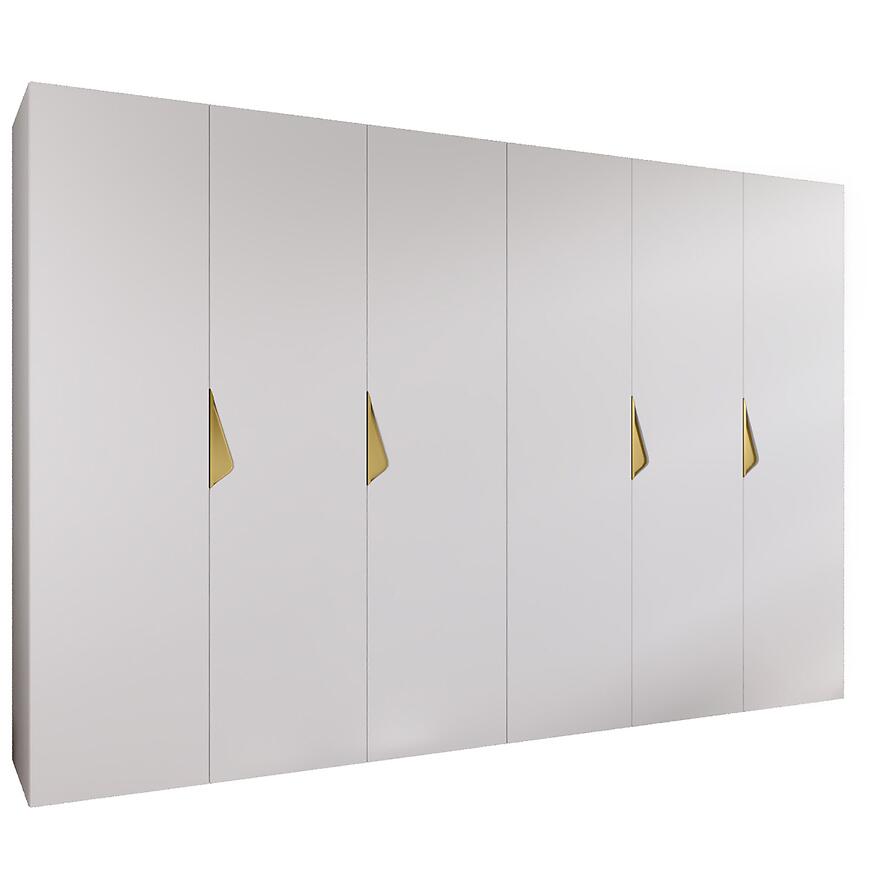 Szafa Sandi 1-300 (2x150) biały/złoty to nowoczesna, kilkudrzwiowa szafa, która łączy biały mat z subtelnymi złotymi detalami, tworząc praktyczny i stylowy mebel do domu lub mieszkania.