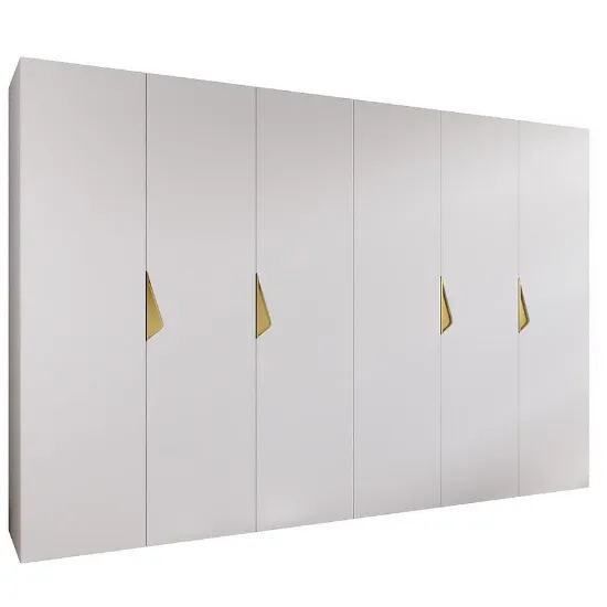Szafa Sandi 1-300 (2x150) z kolekcji SANDI to nowoczesna kilkudrzwiowa szafa o imponującej szerokości 300 cm, łącząca biały mat z eleganckimi złotymi detalami. Prosta, nowoczesna bryła wprowadza do wnętrza harmonijny i stylowy akcent.