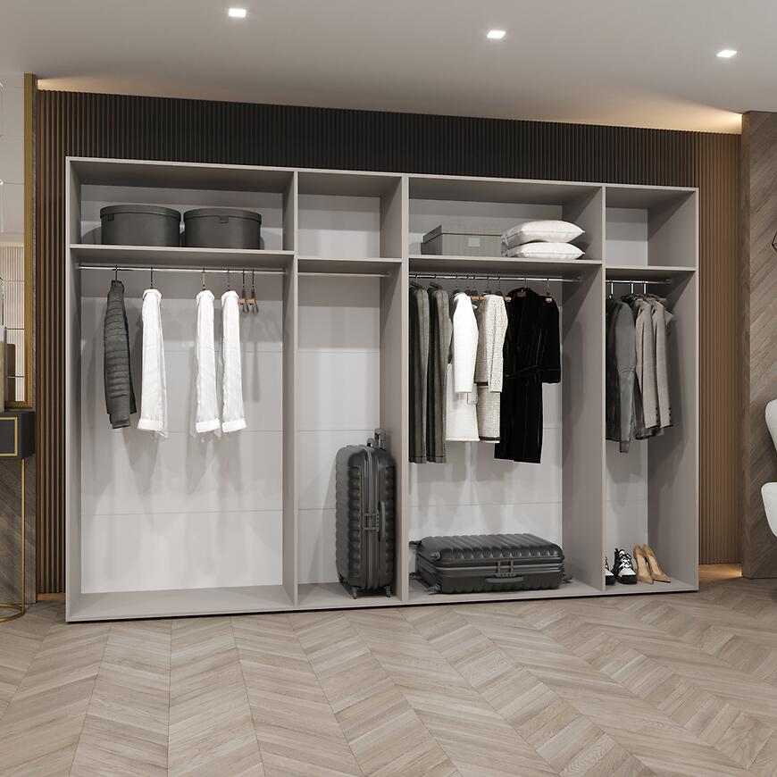 Wymiary 300 cm szerokości, 202 cm wysokości oraz 52 cm głębokości zapewniają przestronną powierzchnię do przechowywania odzieży i dodatków. Fronty i korpus w matowym wykończeniu nadają szafie nowoczesnego charakteru i minimalistycznej elegancji.