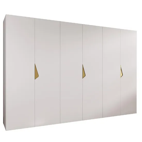 Wymiary 300 cm szerokości, 202 cm wysokości oraz 52 cm głębokości zapewniają przestronną powierzchnię do przechowywania ubrań i dodatków. Matowe fronty i korpus nadają szafie nowoczesny charakter, a złote detale dodają subtelnej elegancji.