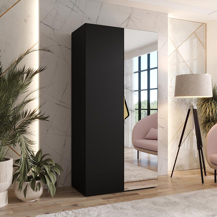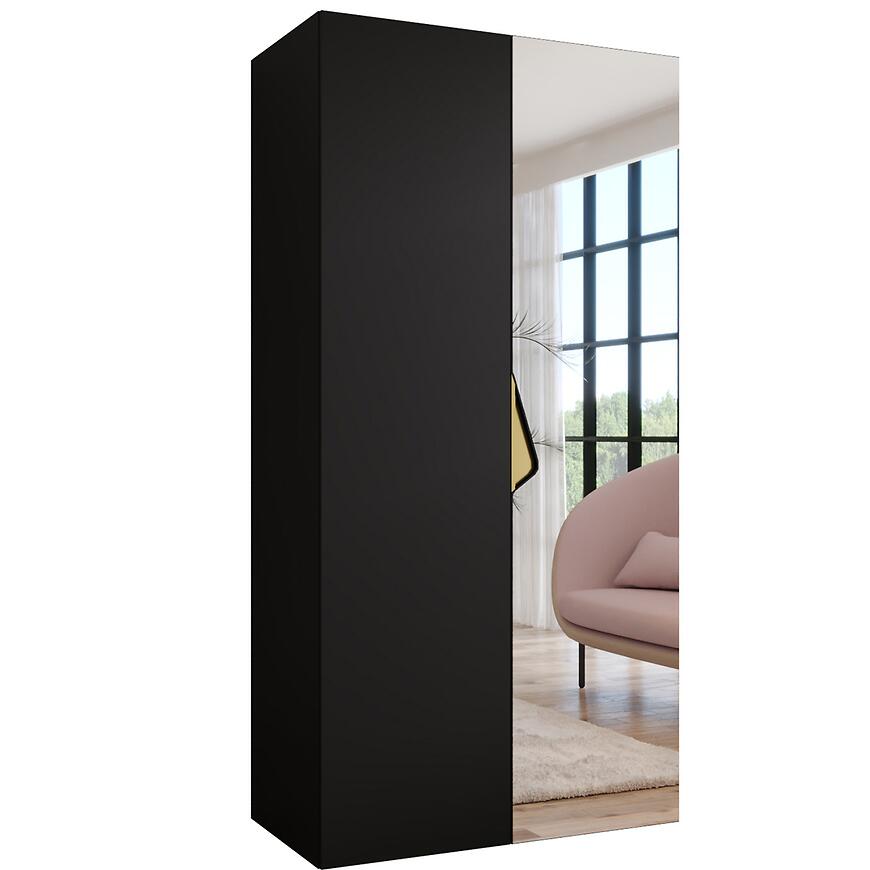 Szafa Sandi 2-100 czarny/złoty to nowoczesna, dwudrzwiowa szafa z lustrem, która łączy elegancki czarny połysk z subtelnymi złotymi detalami, tworząc praktyczny i stylowy mebel do domu lub mieszkania.