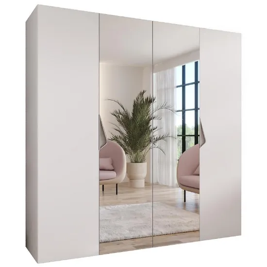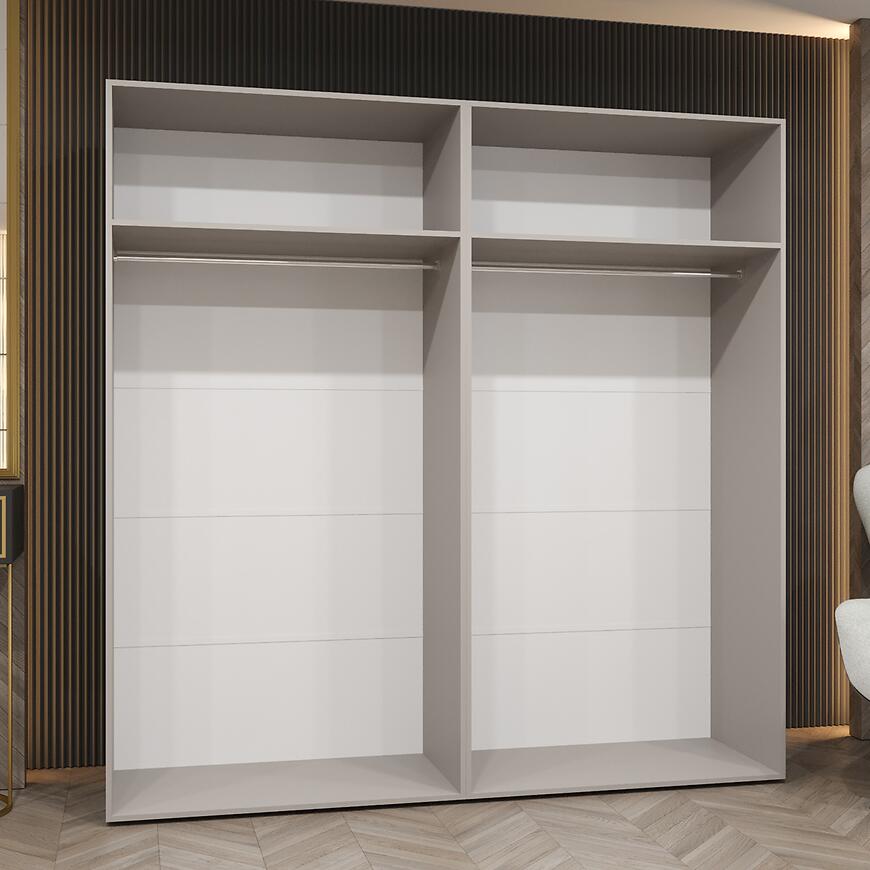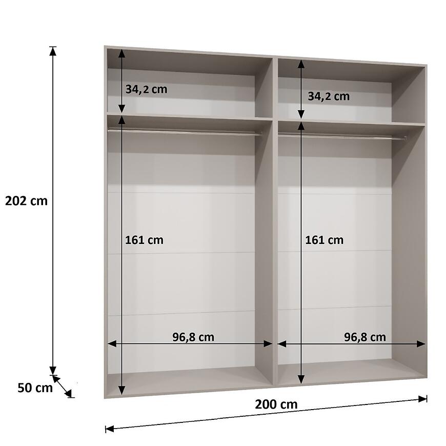 Wymiary 200 cm szerokości, 202 cm wysokości i 52 cm głębokości zapewniają dużą przestrzeń do przechowywania odzieży oraz dodatków. Fronty w kolorze białym w połysku efektownie odbijają światło, natomiast matowy korpus podkreśla minimalistyczny charakter. Wbudowane lustro optycznie powiększa przestrzeń i zwiększa komfort codziennego użytkowania.