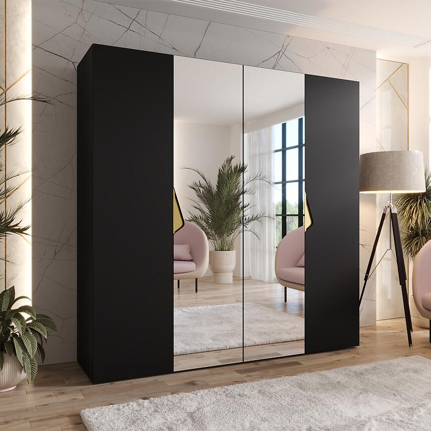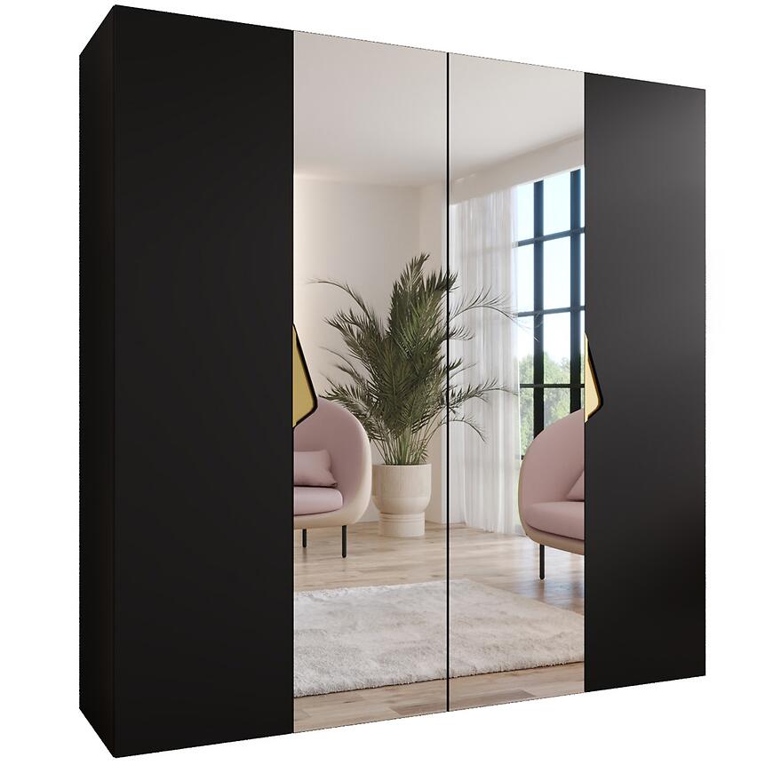 Wymiary 200 cm szerokości, 202 cm wysokości oraz 52 cm głębokości zapewniają dużą przestrzeń do przechowywania odzieży i dodatków. Fronty w czarnym połysku efektownie odbijają światło, a matowy korpus podkreśla minimalistyczny styl. Lustro na froncie optycznie powiększa przestrzeń i zwiększa funkcjonalność szafy.