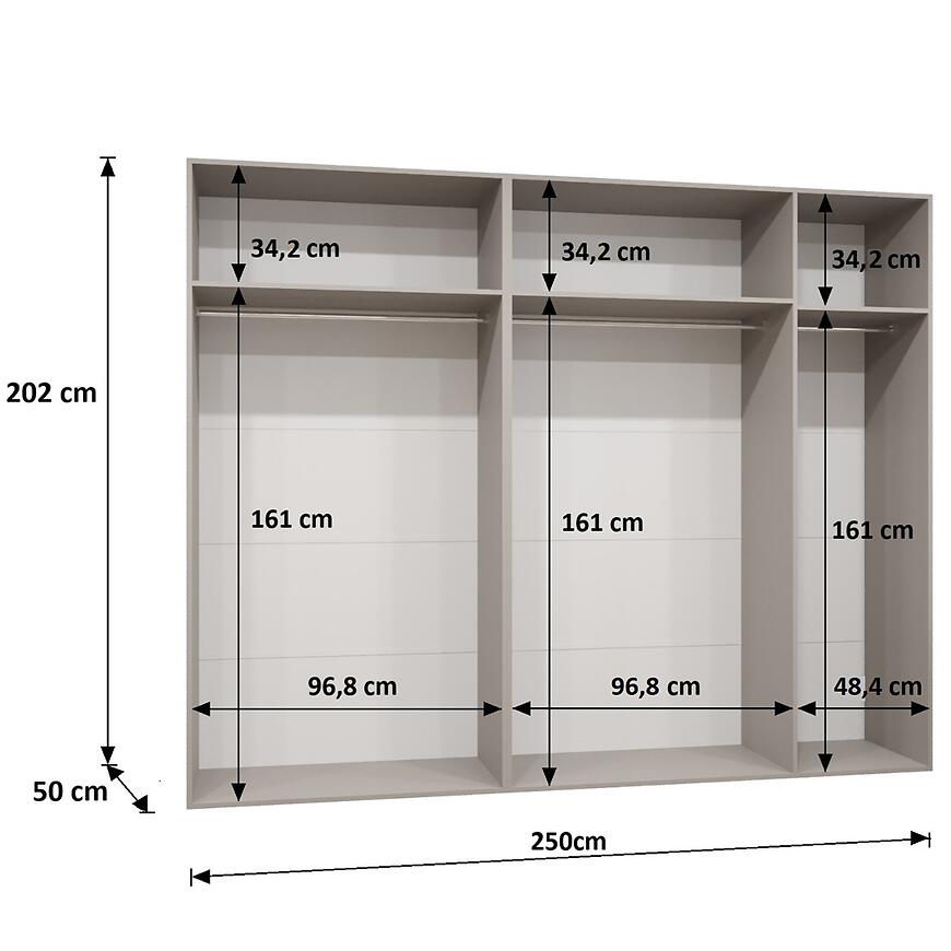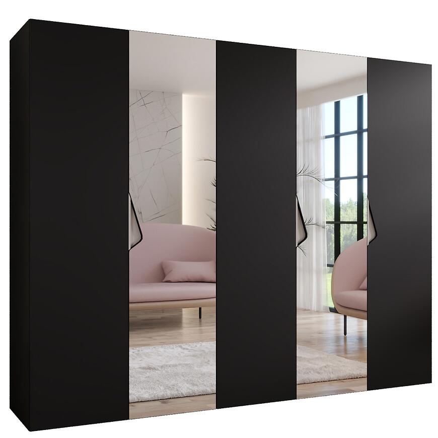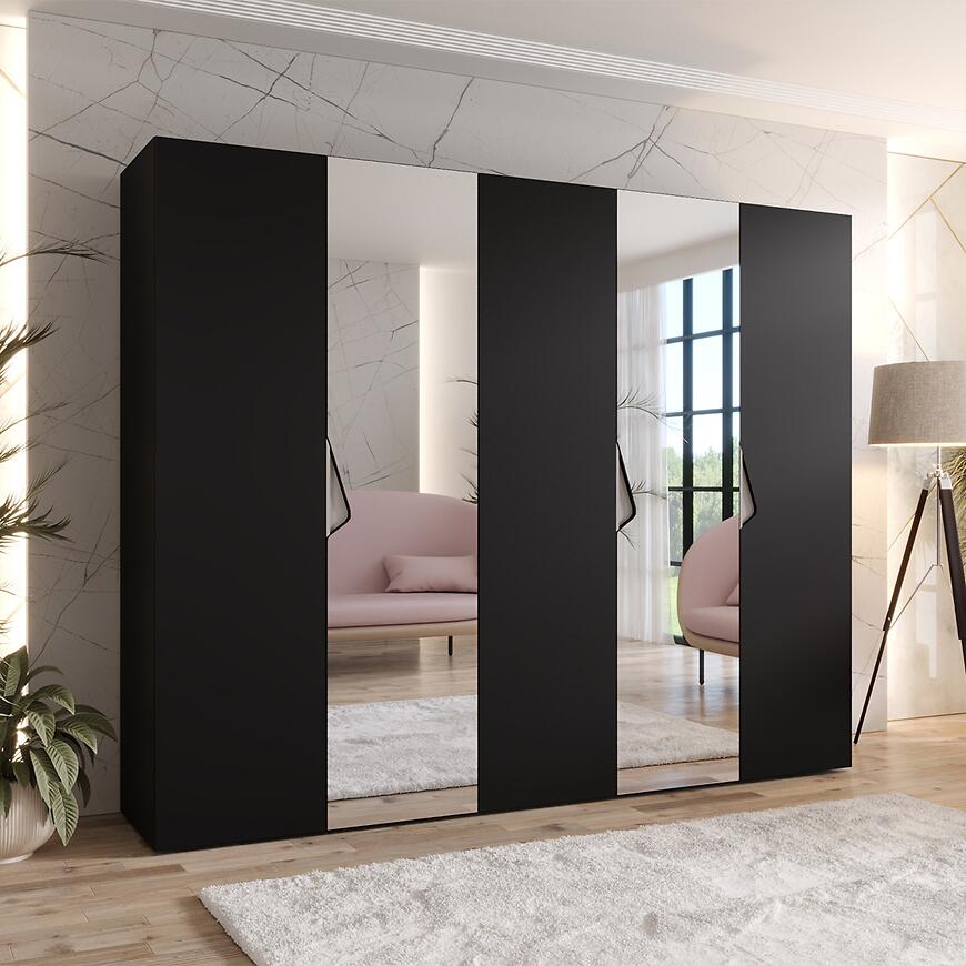 Szafa Sandi 2-250 czarny/kaszmir to przestronny i stylowy mebel zaprojektowany z myślą o wygodnym przechowywaniu garderoby. Szerokość 250 cm, wysokość 202 cm oraz głębokość 52 cm zapewniają dużą ilość miejsca na ubrania, tekstylia i akcesoria. Połączenie czarnych frontów w połysku z matowym korpusem tworzy elegancki kontrast, który podkreśla nowoczesny charakter wnętrza. Lustra na drzwiach optycznie powiększają przestrzeń i ułatwiają codzienne przygotowania.