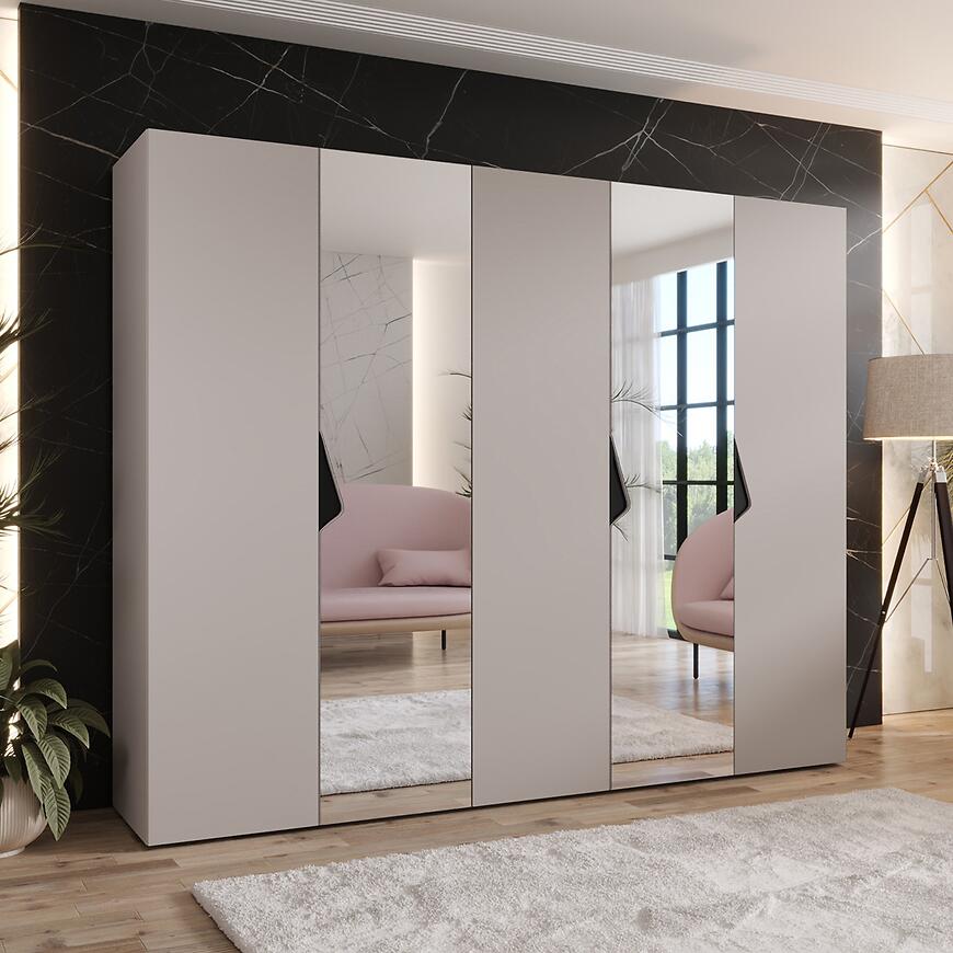 Połączenie kaszmiru w połysku z czarnym matowym korpusem nadaje szafie nowoczesny i luksusowy charakter. Lustra na froncie zwiększają praktyczność i estetykę wnętrza, sprawiając, że szafa Sandi 2-250 kaszmir/czarny jest idealnym wyborem dla osób ceniących funkcjonalność połączoną z elegancją.