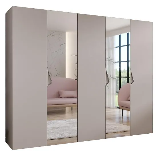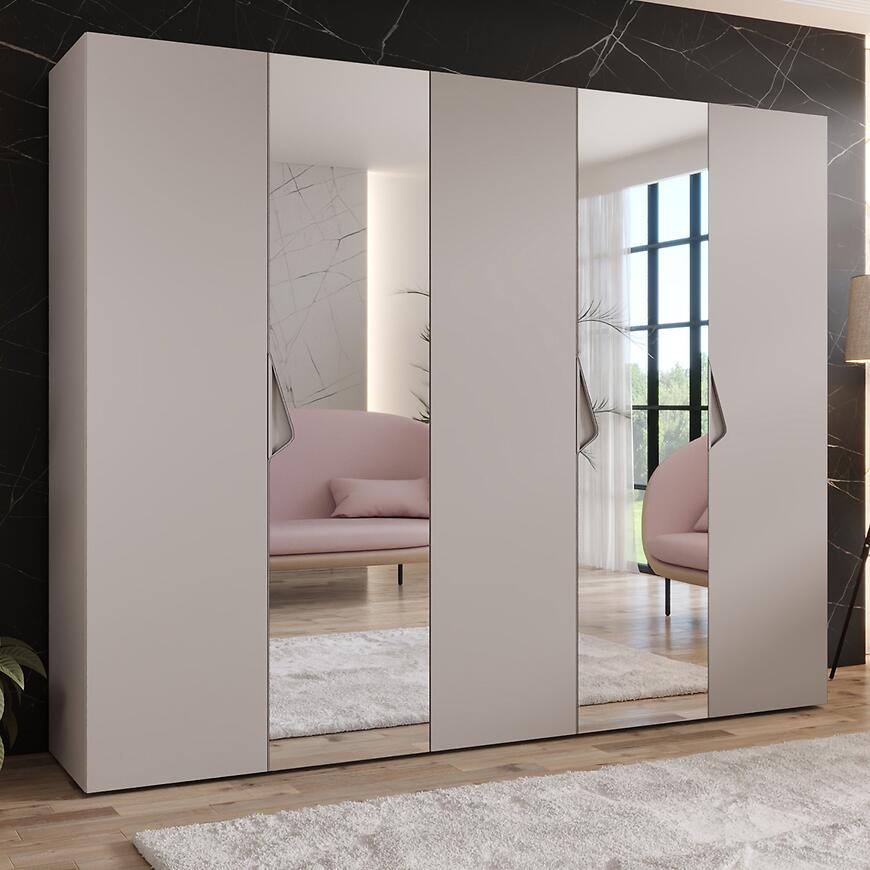 Fronty i korpus w jednolitym kolorze kaszmir nadają szafie spójny i elegancki wygląd. Fronty w połysku w połączeniu z matowym korpusem tworzą nowoczesny design, a lustra na drzwiach optycznie powiększają przestrzeń i dodają funkcjonalności.