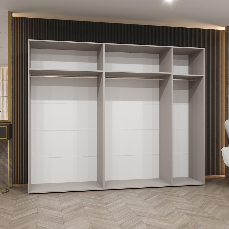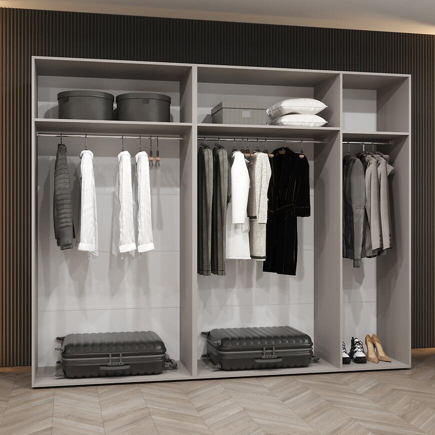 Szafa Sandi 2-250 kaszmir/kaszmir to przestronny mebel zaprojektowany z myślą o wygodnym przechowywaniu ubrań i dodatków. Jej wymiary – szerokość 250 cm, wysokość 202 cm i głębokość 52 cm – umożliwiają praktyczne organizowanie garderoby w sypialni lub przedpokoju.
