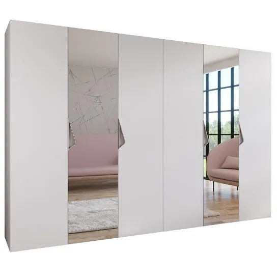 Szafa Sandi 2-300 (2x150) w wybarwieniu biały/kaszmir to przestronny mebel o szerokości 300 cm, który zapewnia bardzo dużą przestrzeń do przechowywania. Klasyczne, kilkudrzwiowe fronty z lustrem zwiększają komfort użytkowania i nadają bryle lekkości.