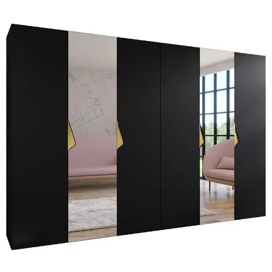Szafa Sandi 2-300 (2x150) czarny/złoty – pojemna, nowoczesna szafa z lustrem o szerokości 300 cm. Czarne fronty w połysku ze złotymi akcentami podkreślają elegancki charakter mebla.