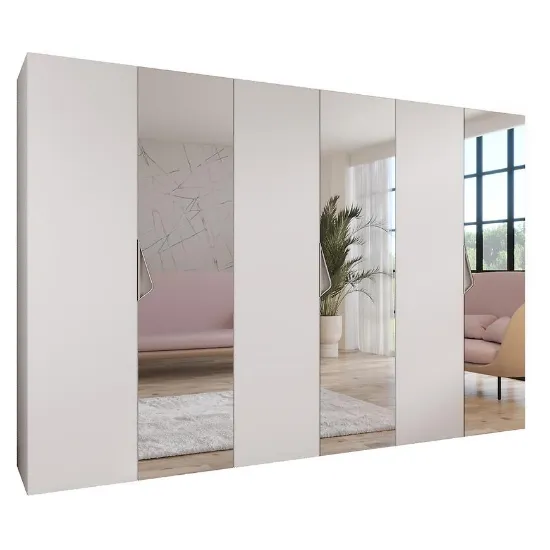 Szafa Sandi 2-300 (3x100) w wybarwieniu biały/kaszmir to przestronny mebel o szerokości 300 cm, zapewniający dużą przestrzeń do przechowywania. Kilkudrzwiowe, klasyczne fronty z lustrem ułatwiają użytkowanie i nadają bryle lekkości.