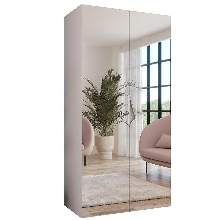 Dwudrzwiowa szafa Sandi 3-100 w klasycznym białym kolorze z kaszmirowymi akcentami to idealne połączenie stylu i funkcjonalności. Połyskujące fronty dodają lekkości i elegancji, a wbudowane lustro optycznie powiększa przestrzeń i ułatwia codzienne użytkowanie.