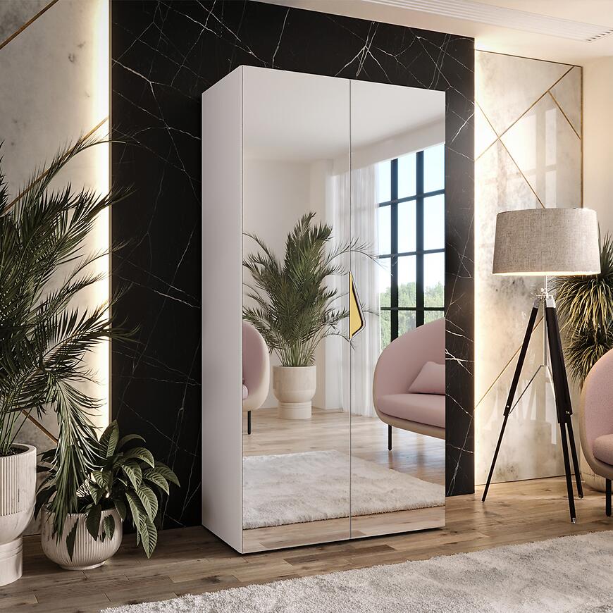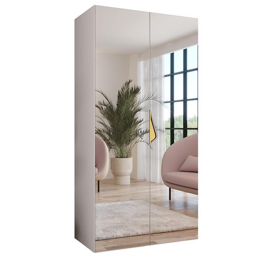 Szafa Sandi 3-100 biały/złoty – nowoczesna szafa dwudrzwiowa z lustrem, 100 cm szerokości. Białe fronty w połysku ze złotym akcentem, elegancka i funkcjonalna.