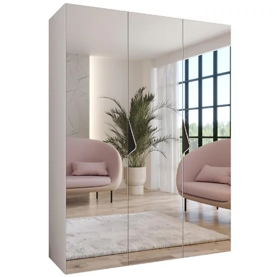 Szafa Sandi 3-150 w wybarwieniu biały/czarny to funkcjonalny mebel do nowoczesnych wnętrz. Trzydrzwiowa konstrukcja z klasycznymi drzwiami i dużym lustrem zapewnia wygodny dostęp do odzieży oraz optycznie powiększa przestrzeń w pomieszczeniu. Połyskujące białe fronty w połączeniu z czarnymi detalami nadają szafie nowoczesny i elegancki wygląd, a matowy korpus harmonijnie uzupełnia całość.
