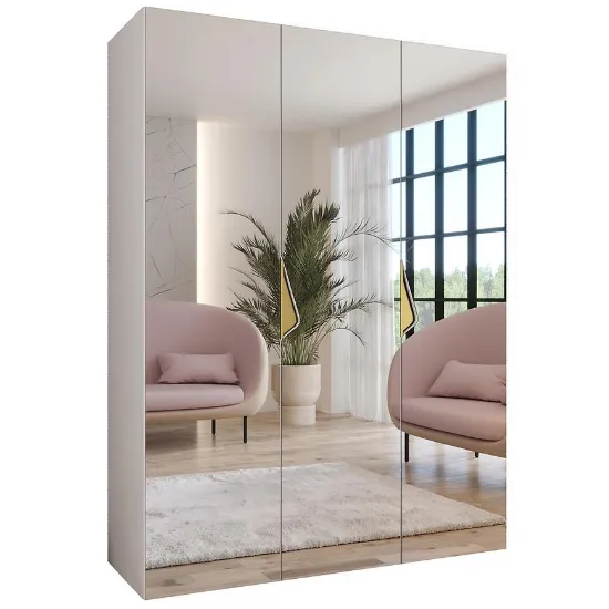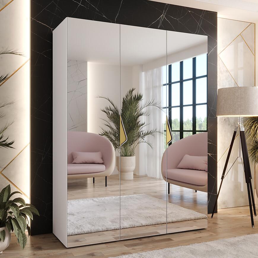 Szafa Sandi 3-150 w eleganckim połączeniu bieli i złota to funkcjonalny mebel do nowoczesnych wnętrz. Trzydrzwiowa konstrukcja z klasycznymi drzwiami i dużym lustrem zapewnia wygodny dostęp do odzieży i optycznie powiększa przestrzeń pokoju. Połyskujące fronty nadają szafie lekkości i nowoczesnego charakteru, a matowy korpus harmonijnie dopełnia całość.