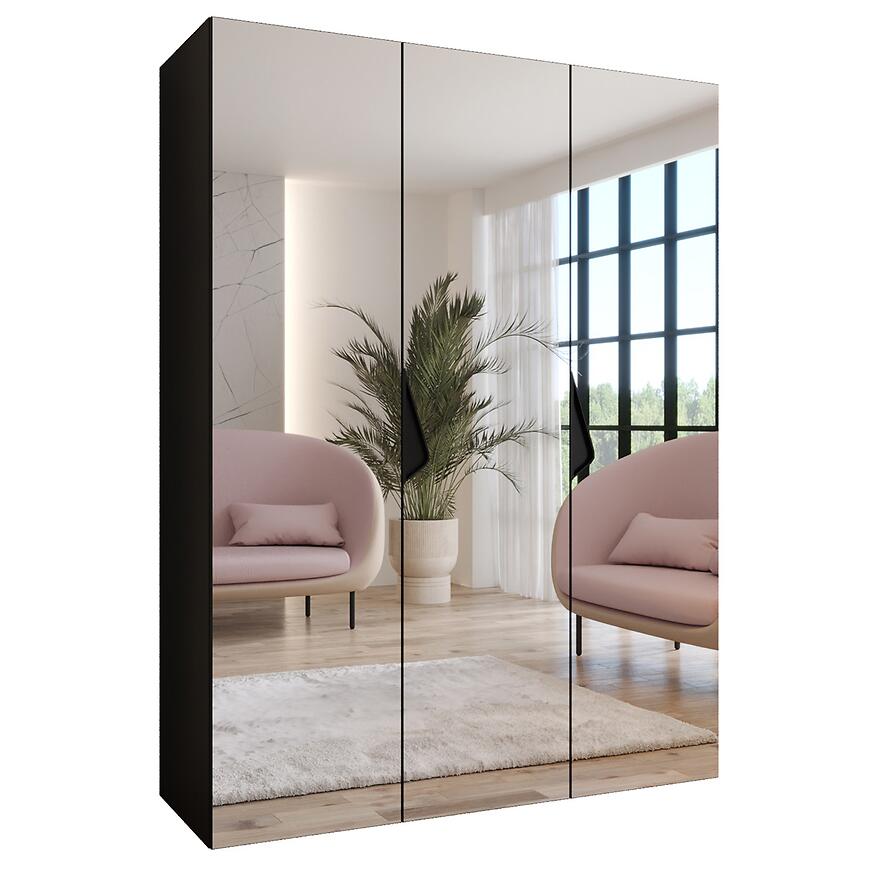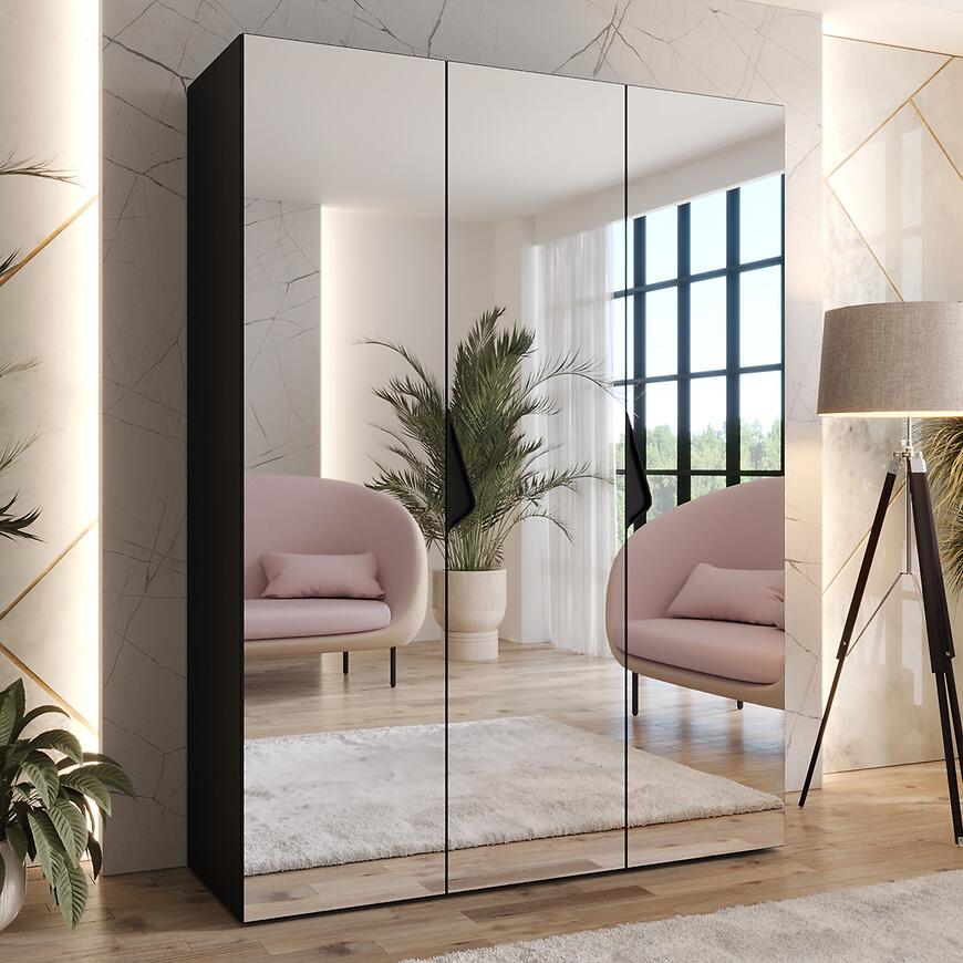 Szafa Sandi 3-150 czarny/czarny – nowoczesna, trzydrzwiowa szafa z lustrem o szerokości 150 cm. Połyskujące fronty, elegancki design i praktyczna przestrzeń do przechowywania.