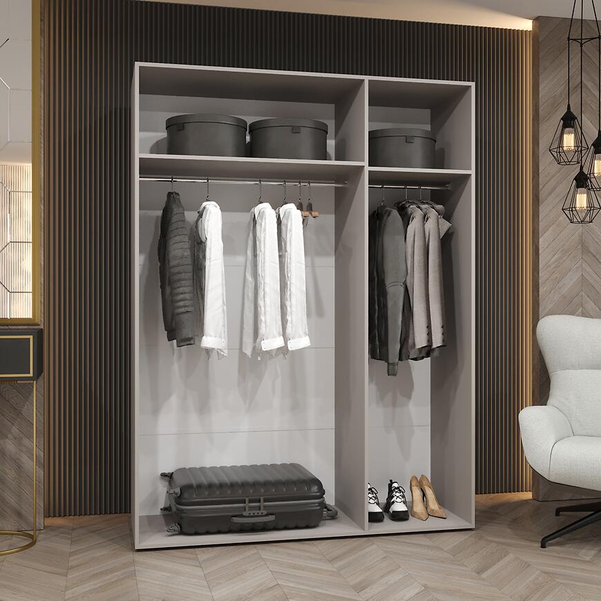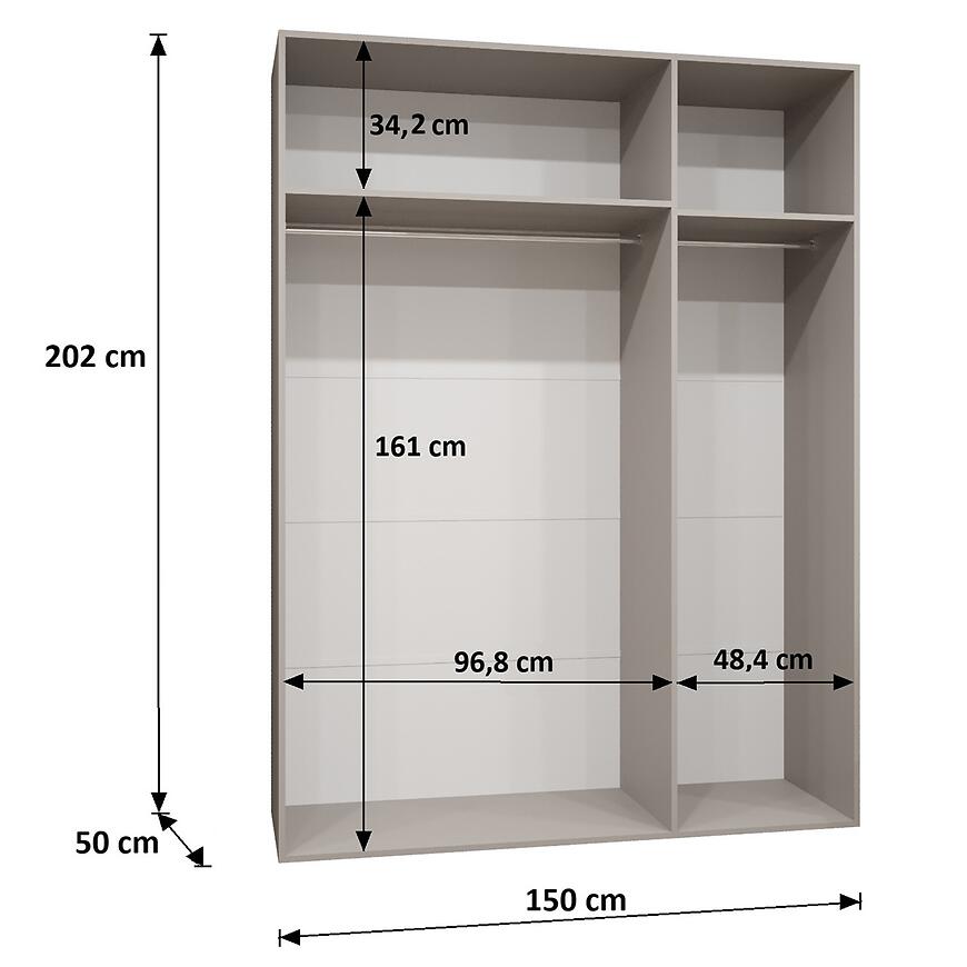 Szafa Sandi 3-150 została wykonana z wysokiej jakości płyt laminowanych – fronty z płyty laminowanej, korpus z płyty wiórowej laminowanej. Konstrukcja zapewnia trwałość i stabilność mebla przy codziennym użytkowaniu.