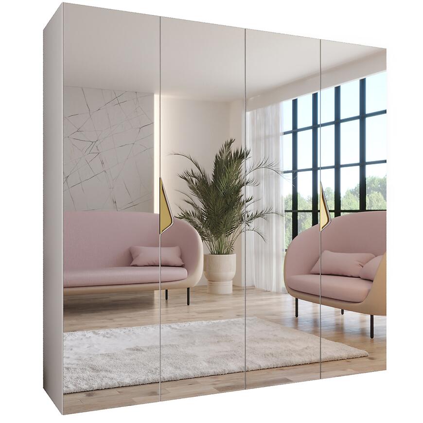 Szafa Sandi 3-200 biały/złoty – nowoczesna, kilkudrzwiowa szafa z lustrem o szerokości 200 cm. Połyskujące białe fronty, eleganckie złote detale i pojemna przestrzeń do przechowywania.