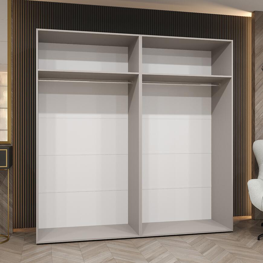 Szafa Sandi 3-200 w połączeniu bieli z subtelnymi złotymi akcentami to stylowy i funkcjonalny mebel do nowoczesnych wnętrz. Kilkudrzwiowa konstrukcja z klasycznymi drzwiami i dużym lustrem zapewnia wygodny dostęp do odzieży oraz optycznie powiększa przestrzeń w pomieszczeniu. Połyskujące fronty w białym kolorze nadają meblowi lekkości i nowoczesnego charakteru, a matowy korpus harmonijnie dopełnia całość.