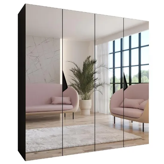 Szafa Sandi 3-200 w eleganckim, całkowicie czarnym wybarwieniu to stylowy i funkcjonalny mebel do nowoczesnych wnętrz. Kilkudrzwiowa konstrukcja z klasycznymi drzwiami i dużym lustrem zapewnia wygodny dostęp do odzieży oraz optycznie powiększa przestrzeń w pomieszczeniu. Połyskujące fronty nadają meblowi nowoczesnego charakteru, a matowy korpus harmonijnie dopełnia całość.