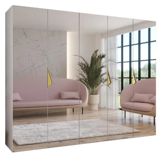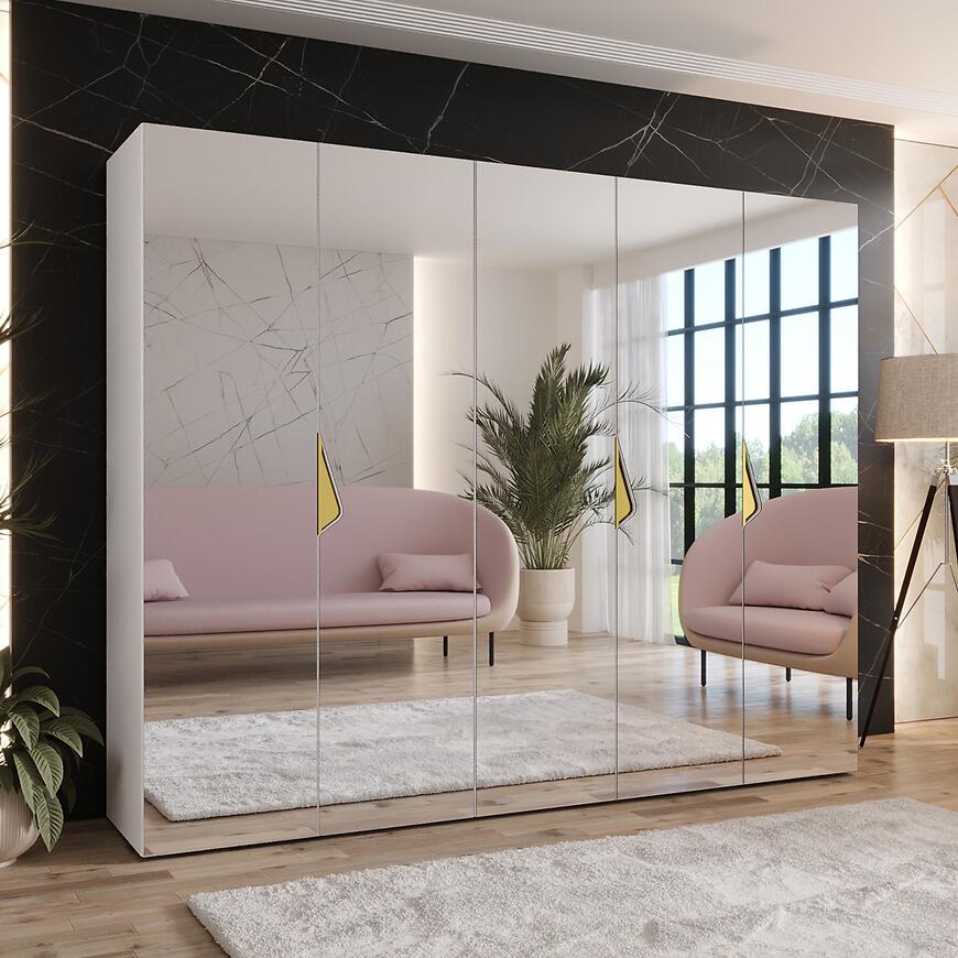 Szafa Sandi 3-250 biały/złoty to połączenie połyskującej bieli z subtelnym złotym detalem, tworząc nowoczesny, stylowy mebel. Kilkudrzwiowa konstrukcja z wbudowanym lustrem optycznie powiększa przestrzeń i zwiększa komfort codziennego użytkowania, ułatwiając organizację przechowywanych rzeczy.